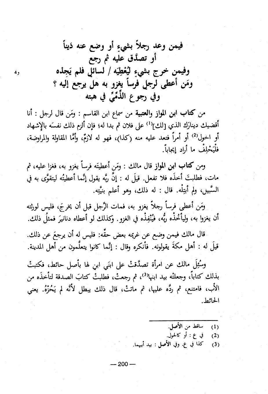 فيمن وعد رجلا بشيء أو وضع عنه دينا أو تصدق علوفيمن خرج بشيء ليعطيه/ لسائل فلم يجده ومن أعطى لرجل فرسا يغزو به هل يرجع إليه؟ وفي رجوع الذمي في هبته من كتاب ابن المواز والعتبية من سماع ابن القاسم: ومن قال لرجل: أنا أقضيك دينارك الذي [لك] (¬1) على فلان ثم بدا له؛ فإن ألزم ذلك نفسه بالإشهاد أو الحول (¬2) أو أمرا فتعد عليه منه (كذا)، فهو له لازم، وأما المقاولة والمراوضة، فليحلف ما أراد إيجابا. ومن كتاب ابن المواز قال مالك: ومن أعطيته فرسا يغزو به، فغزا عليه، ثم مات، فطلبت أخذه فلا تفعل. قيل له: إن ربه يقول إنما أعطيته ليتقوي به في السبيل، ولم أبتله. قال: له ذلك، وهو أعلم بنيته. ومن أعطى فرسا رجلا يغزو به، فمات الرجل قبل أن يخرج، فليس لورثته أن يغزوا به، وليأخذه ربه، فينفذه في الغزو. وكذلك لو أعطاه دنانير فمثل ذلك. قال مالك فيمن وضع عن غريمه بعض حقه: فليس له أن يرجع عن ذلك. قيل له: أهل مكة يقولونه. فأنكره وقال: إنما كانوا يتعلمون من أهل المدينة. وسئل مالك عن امرأة تصدقت على ابني ابن لها بأصل حائط، فكتبت بذلك كتابا، وجعلته بيد ابنها (¬3)، ثم رجعت، فطلبت كتاب الصدقة لتأخذه من الأب، فامتنع، ثم رده عليها، ثم ماتت، قال ذلك يبطل لأنه لم يحزه. يعني الحائط.