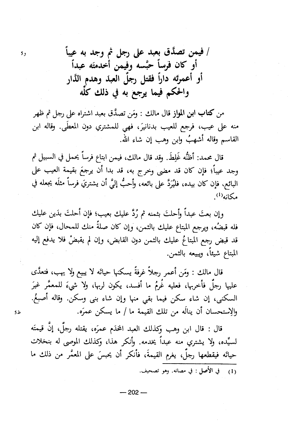فيمن تصدق بعبد على رجل ثم وجد به عيبا أو كان فرسا حبسه وفيمن أخدمته عبدا أو أعمرته دارا فقتل رجل العبد وهدم الدار والحكم فيما يرجع به في ذلك كله من كتاب ابن المواز قال مالك: ومن تصدق بعبد اشتراه على رجل ثم ظهر منه على عيب، فرجع للعيب بدنانير، فهي للمشتري دون المعطى. وقاله ابن القاسم وقاله أشهب وابن وهب إن شاء الله. قال محمد: أظنه غلط. وقد قال مالك، فيمن ابتاع فرسا يحمل في السبيل ثم وجد عيبا؛ فإن كان قد مضى وخرج به، قد بدا أن يرجع بقيمة العيب على البائع، فإن كان بيده، فليرد على بائعه، وأحب إلي أن يشتري فرسا مثله يجعله في مكانه (¬1). وإن بعت عبدا وأحلت بثمنه ثم رد عليك بعيب؛ فإن أحلت بدين عليك فله قبضه، ويرجع المبتاع عليك بالثمن، وإن كان صلة منك للمحال، فإن كان قد قبض رجع المبتاع عليك بالثمن دون القابض، وإن لم يقبض فلا يدفع إليه المبتاع شيئا، ويبيعه بالثمن. قال مالك: ومن أعمر رجلا غرفة يسكنها حياته لا يبيع ولا يهب، فتعدى عليها رجل فأخربها، فعليه غرم ما أفسد، يكون لربها، ولا شيء للمعمر غير السكنى، إن شاء سكن فيما بقي منها وإن شاء بنى وسكن. وقاله أصبغ. والاستحسان أن يناله من تلك القيمة ما/ ما يسكن عمره. قال: قال ابن وهب وكذلك العبد المخدم عمره، يقتله رجل، إن قيمته لسيدة، ولا يشتري منه عبدا يخدمه. وأنكر هذا، وكذلك الموصى له بنخلات حياته فيقطعها رجل، يغرم القيمة، فأنكر أن يحبس على المعمر من ذلك ما