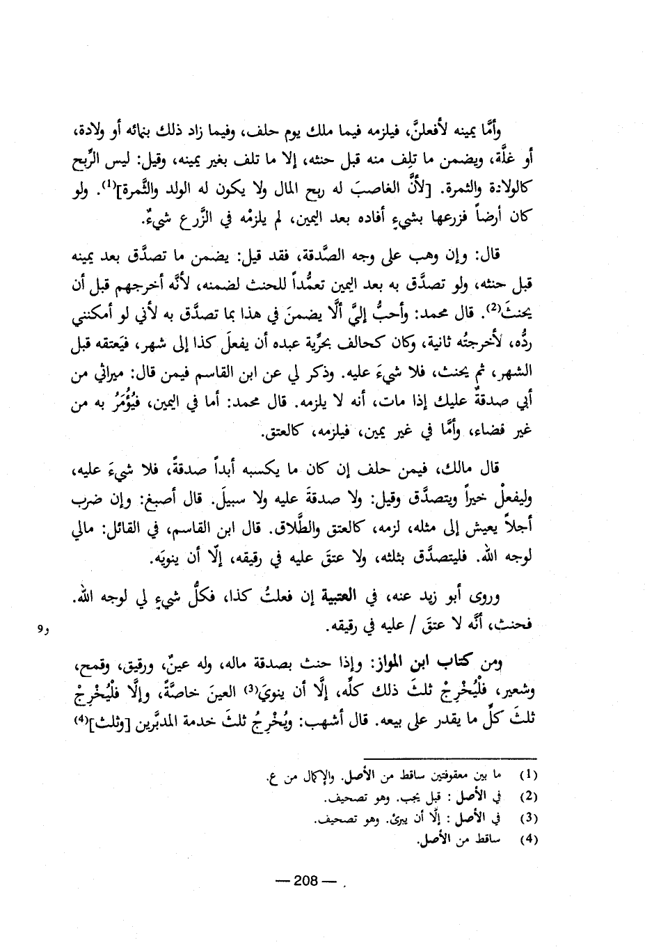 وأما يمينه لأفعلن، فيلزمه فيما ملك يوم حلف، وفيما زاد ذلك بنمائه أو ولادة، أو غلة، ويضمن ما تلف منه قبل حنثه، إلا ما تلف بغير يمينه، وقيل: ليس الربح كالولادة والثمرة. [لأن الغاصب له ربح المال ولا يكون له الولد والثمرة] (¬1). ولو كان أرضا فزرعها بشيء أفاده بعد اليمين، لم يلزمه في الزرع شيء. قال: وإن وهب على وجه الصدقة، فقد قيل: يضمن ما تصدق بعد يمينه قبل حنثه، ولو تصدق به بعد اليمين تعمدا للحنث لضمنه، لأنه أخرجهم قبل أن يحنث (¬2). قال محمد: وأحب إلي ألا يضمن في هذا بما تصدق به لأني لو أمكنني رده، لأخرجته ثانية، وكان كحالف بحرية عبده أن يفعل كذا إلى شهر، فيعتقه قبل الشهر، ثم يحنث، فلا شيء عليه. وذكر لي عن ابن القاسم فيمن قال: ميراثي من أبي صدقة عليك إذا مات، أنه لا يلزمه. قال محمد: أما في اليمين، فيؤمر به من غير فضاء، وأما في غير يمين، فيلزمه، كالعتق. قال مالك، فيمن حلف إن كان ما يكسبه أبدا صدقة، فلا شيء عليه، وليفعل خيرا ويتصدق وقيل: ولا صدقة عليه ولا سبيل. قال أصبغ: وإن ضرب أجلا يعيش إلى مثله، لزمه، كالعتق والطلاق. قال ابن القاسم، فمالي لوجه الله. فليتصدق بثلثه، ولا عتق عليه في رقيقه، إلا أن ينويه. وروى أبو زيد عنه، في العتبية إن فعلت كذا، فكل شيء لي لوجه الله. فحنث، أنه لا عتق/ عليه في رقيقه. ومن كتاب ابن المواز: وإذا حنث بصدقة ماله، وله عين، ورقيق، وقمح، وشعير، فليخرج ثلث ذلك كله، إلا أن ينوي (¬3) العين خاصة، وإلا فليخرج ثلث كل ما يقدر على بيعه. قال أشهب: ويخرج ثلث خدمة المدبرين [وثلث] (¬4)