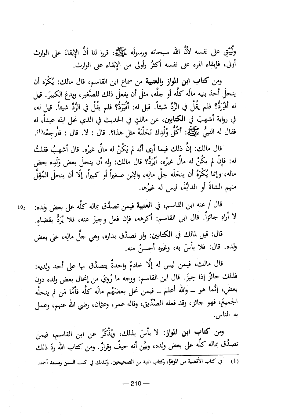 وليبق على نفسه لأن الله سبحانه ورسوله - صلى الله عليه وسلم -، قررا لنا أن الإبقاء على الوارث أولى، فإبقاء المرء على نفسه أكثر وأولى من الإبقاء على الوارث. ومن كتاب ابن المواز والعتبية من سماع ابن القاسم، قال مالك: يكره أن ينحل أحد بنيه ماله كله أو جله، مثل أن يفعل ذلك للصغير، ويدع الكبير. قيل له أفيرد؟ فلم يقل في الرد شيئا. قيل له: أفيرد؟ فلم يقل في الرد شيئا. قيل له، في رواية أشهب في الكتابين، عن مالك في الحديث في الذي نحل ابنه عبدا، له فقال له النبي - صلى الله عليه وسلم -: أكل ولدك نحلته مثل هذا؟. قال: لا. قال: فأرجعه (¬1). قال مالك: إن ذلك فيما أرى أنه لم يكن له مال غيره. قال أشهب فقلت له: فإن لم يكن له مال غيره، أيرد؟ قال مالك: وله أن ينحل بعض ولده بعض ماله، وإنما يكره أن ينحله جل ماله، والابن صغيرا او كبيرا، إلا أن ينحل المقل منهم الشاة أو الدابة، ليس له غيرها. قال/ عنه ابن القاسم، في العتبية فيمن تصدق بماله كله على بعض ولده: لا أراه جائزا. قال ابن القاسم: أكرهه، فإن فعل وجيز عنه، فلا يرد بقضاء. قال: قيل لمالك في الكتابين: ولو تصدق بداره، وهي جل ماله، على بعض ولده. قال: فلا بأس به، وغيره أحسن منه. قال مالك، فيمن ليس له إلا خادم واحدة يتصدق بها على أحد ولديه: فذلك جائز إذا حيز. قال ابن القاسم: ووجه ما روي من إنحال بعض ولده دون بعض، إنما هو- والله أعلم- فيمن نحل بعضهم ماله كله فأما من لم ينحله الجميع، فهو جائز، وقد فعله الصديق، وقاله عمر، وعثمان، رضي الله عنهم، وعمل به الناس. ومن كتاب ابن المواز: لا بأس بذلك، ويذكر عن ابن القاسم، فيمن تصدق بماله كله على بعض ولده، وبين أنه حيف وقرار. ومن كتاب الله رد ذلك