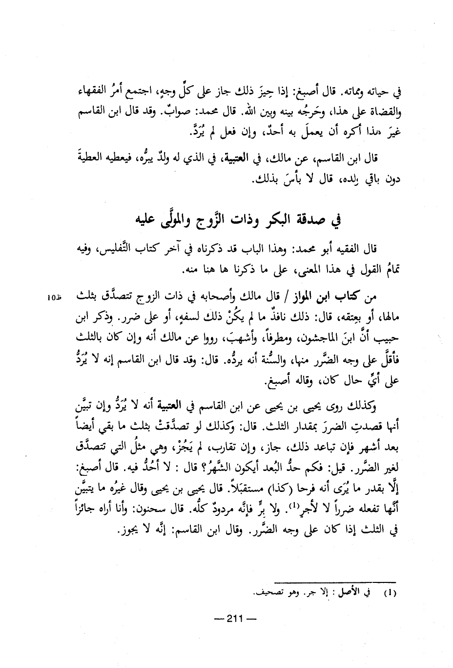 في حياته ومماته. قال أصبغ: إذا حيز ذلك جاز على كل وجه، اجتمع أمر الفقهاء والقضاة على هذا، وحرجه بينه وبين الله. قال محمد: صواب. وقد قال ابن القاسم غير هذا أكره أن يعمل به أحد، وإن فعل لم يرد. قال ابن القاسم، عن مالك، في العتبية، في الذي له ولد يبره، فيعطيه العطية دون باقي ولده، قال لا بأس بذلك. في صدقة البكر وذات الزوج والمولى عليه قال الفقيه أبو محمد: وهذا الباب قد ذكرناه في آخر كتاب التفليس، وفيه تمام القول في هذا المعنى، على ما ذكرنا ها هنا منه. من كتاب ابن المواز/ قال مالك وأصحابه في ذات الزوج تتصدق بثلث مالها، أو بعتقه، قال: ذلك نافذ ما لم يكن ذلك لسفه، أو على ضرر. وذكر ابن حبيب أن ابن الماجشون، ومطرفا، وأشهب، رووا عن مالك أنه وإن كان بالثلث فأقل على وجه الضرر منها، والسنة أنه يرده. قال: وقد قال ابن القاسم إنه لا يرد على أي حال كان، وقاله أصبغ. وكذلك روى يحيى بن يحيى عن ابن القاسم في العتبية أنه تبين أنها قصدت الضرر بمقدار الثلث. قال: وكذلك لو تصدقت بثلث ما بقي أيضا بعد أشهر فإن تباعد ذلك، جاز، وإن تقارب، لم يجز، وهي مثل التي تتصدق لغير الضرر. قيل: فكم حد البعد أيكون الشهر؟ قال: لا أحد فيه. قال أصبغ: إلا بقدر ما يرى أنه فرحا (كذا) مستقبلا. قال يحيى بن يحيى وقال غيره ما يتبين أنها تفعله ضررا لا لأجر (¬1). ولا بر فإنه مردود كله. قال سحنون: وأنا أراه جائزا في الثلث إذا كان على وجه الضرر. وقال ابن القاسم: إنه لا يجوز.