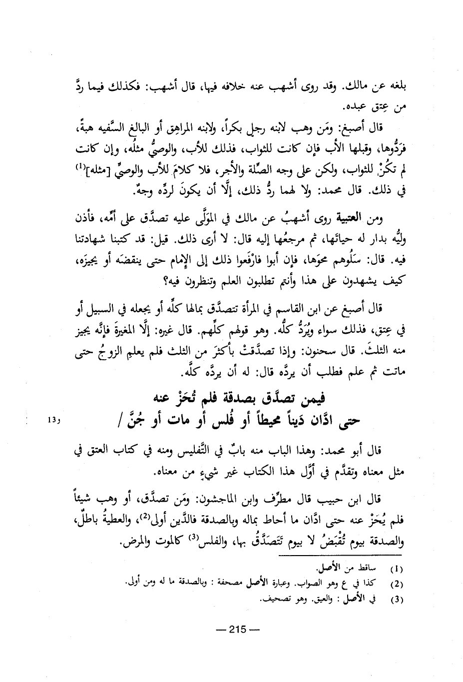 بلغه عن مالك. وقد روى أشهب عنه خلافه فيها، قال أشهب: فكذلك فيما رد من عتق عبده. قال أصبغ: ومن وهب لابنه رجل بكرا، ولابنه المراهق أو البالغ السفيه هبة، فردوها، وقبلها الأب فإن كانت للثواب، فذلك للأب، والوصي مثله، وإن كانت لم تكن للثواب، ولكن على وجه الصلة والأجر، فلا كلام للأب والوصي [مثله] (¬1) في ذلك. قال محمد: ولا لهما رد ذلك، إلا أن يكون لرده وجه. ومن العتبية روى أشهب عن مالك في المولى عليه تصدق على أمه، فأذن وليه بدار له حياتها، ثم مرجعها إليه قال: لا أرى ذلك. قيل: قد كتبنا شهادتنا فيه. قال: سلوهم محوها، فإن أبوا فارفعوا ذلك إلى الإمام حتى ينقضه أو يجيزه، كيف يشهدون على هذا وأ، تم تطلبون العلم وتنظرون فيه؟ قال أصبغ عن ابن القاسم في المرأة تتصدق بمالها كله أو يجعله في السبيل أو في عتق، فذلك سواء ويرد كله. وهو قولهم كلهم. قال غيره: إلا المغيرة فإنه يجيز منه الثلث. قال سحنون: وإذا تصدقت بأكثر من الثلث فلم يعلم الزوج حتى ماتت ثم علم فطلب أن يرده قال: له أن يرده كله. فيمن تصدق بصدقة فلم تحز عنه حتى ادان دينا محيطا أو فلس أو مات أو جن/ قال أبو محمد: وهذا الباب منه باب في التفليس ومنه في كتاب العتق في مثل معناه. قال ابن حبيب قال مطرف وابن الماجشون: ومن تصدق، أو وهب شيئا فلم يحز عنه حتى ادان ما أحاط بماله وبالصدقة فالدين أولى (¬2)، والعطية باطل، والصدقة بيوم تُقْبَضُ لا بيوم تتصدق بها، والفلس (¬3) كالموت والمرض.