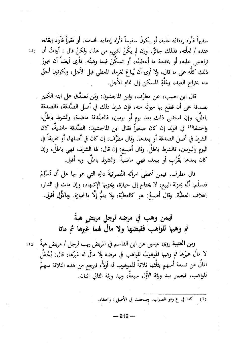 سفيها فأراد إبقاءه عليه، أو يكون سقيما فأراد إبقاءه لخدمته، أو فقيرا فأراد إبقاءه عنده/ لعلته، فذلك جائز، وإن لم يكن لشيء من هذا، ولكن قال: أردت أن تراهنني عليه، أو بخدمة ما أعطيته، او تسكن فيما وهبته. فأرى أيضا أن يجوز ذلك كله على ما قال، ولا أرى أن يباع لغرماء المعطي قبل الأجل، ويكونون أحق منه بخراج العبد، وغلة المسكن إلى تمام الأجل. قال ابن حبيب، عن مطرف، وابن الماجشون: ومن تصدق على ابنه الكبير بصدقة على أن قطع بها ميراثه منه، فإن شرط ذلك في أصل الصدقة، فالصدقة باطل، وإن استثنى ذلك بعد يوم أو يومين، فالصدقة ماضية، والشرط باطل، واختلفا (¬1) في الولد إن كان صغيرا فقال ابن الماجشون: الصدقة ماضية، كان الشرط في أصل الصدقة أو بعدها. وقال مطرف: إن كان في أصلها، أو تفريقا في اليوم واليومين، فالشرط باطل. وقال أصبغ: إن قال: لها الشرط، فهي باطل، وإن كان بعدها بقرب أو ببعد، فهي ماضية والشرط باطل. وبه أقول. قال مطرف، فيمن أعطى امرأته النصرانية داره التي هو بها على أن تسلم فتسلم: أنه بمنزلة البيع، لا يحتاج إلى حيازة، ويجزيها الإشهاد، وإن مات في الدار، بخلاف العطية. وقال أصبغ: هو كالعطية، ولا يتم إلا بالحيازة. وبالأول أقول. فيمن وهب في مرضه لرجل مريض هبة ثم وهبها للواهب فقبضها ولا مال لهما غيرها ثم ماتا ومن العتبية روى عيسى عن ابن القاسم في المريض يهب لرجل/ مريض هبة لا مال غيرها ثم وهبها الموهوب للواهب في مرضه ولا مال له غيرها، قال: يجعل المال من تسعة أسهم يثلثها ثلاثة للموهوب له أولا، فيرجع من هذه الثلاثة سهم للواهب، فيصير بيد ورثة الأول سبعة، وبيد ورثة الثاني اثنان.