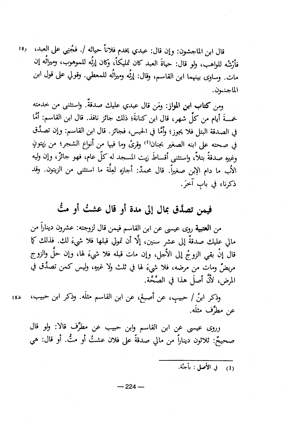 قال ابن الماجشون: وإن قال: عبدي يخدم فلانا حياته/. فجني على العبد، فأرشه للواهب، ولو قال: حياة العبد كان تمليكا، وكان إرثه للموهوب، وميراثه إن مات. وساوى بينهما ابن القاسم، وقال: إرثه وميراثه للمعطي. وقولي على قول ابن الماجنون. ومن كتاب ابن المواز: ومن قال عبدي عليك صدقة. واستثنى من خدمته خمسة أيام من كل شهر، قال ابن كنانة؛ ذلك جائز نافذ. قال ابن القاسم: أما في الصدقة البتل فلا يجوز؛ وأما في الحبس، فجائز. قال ابن القاسم: وإن تصدق في صحته على ابنه الصغير بجنان (¬1) وقرى وما فيها من أنواع الشجر؛ من زيتون وغيره صدقة بتلا، واستثنى أقساط زيت المسجد له كل عام، فهو جائز، وإن وليه الأب ما دام الابن صغيرا. قال محمد: أجازه لعلة ما استثنى من الزيتون. وقد ذكرنا، في باب آخر. فيمن تصدق بمال إلى مدة أو قال عشت أو مت من العتبية روى عيسى عن ابن القاسم فيمن قال لزوجته: عشرون دينارا من مالي عليك صدقة إلى عشر سنين، إلا أن تموتي قبلها فلا شيء لك. فذلك كما قال إن بقي الزوج إلى الأجل، وإن مات قله فلا شيء لها، وإن حل والزوج مريض ومات من مرضه، فلا شيء لها في ثلث ولا غيره، وليس كمن تصدق في المرض، لأن أصل هذا في الصحة. وذكر ابن/ حبيب، عن أصبغ، عن ابن القاسم مثله. وذكر ابن حبيب، عن مطرف مثله. وروى عيسى عن ابن القاسم وابن حبيب عن مطرف قالا: ولو قال صحيح: ثلاثون دينارا من مالي صدقة على فلان عشت أو مت. أو قال: هي