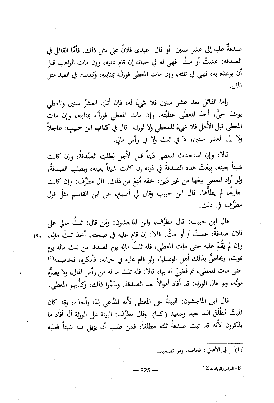 صدقة عليه إلى عشر سنين. أو قال: عبدي فلان على مثل ذلك. فأما القائل في الصدقة: عشت أو مت. فهي له في حياته إن قام عليه، وإن مات الواهب قبل أن يوعده به، فهي في ثلثه، وإن مات المعطي فورثته بمثابته، وكذلك في العبد مثل المال. وأما القائل بعد عشر سنين فلا شيء له، فإن أتت العشر سنين والمعطي يومئذ حي، أخذ المعطى عطيته، وإن مات المعطي فورثته بمثابته، وإن مات المعطى قبل الأجل فلا شيء للمعطي ولا لورثته. قال في كتاب ابن حبيب: عاجلا ولا إلى العشر سنين، لا في ثلث ولا في رأس مال. قالا: وإن استحدث المعطي دينا قبل الأجل بطلت الصدقة، وإن كانت شيئا بعينه، بيعت هذه الصدقة في دينه إن كانت شيئا بعينه، وبطلت الصدقة، ولو أراد المعطي بيعها من غير دين، لحقه منع من ذلك. قال مطرف: وإن كانت جارية، لم يطأها. قال ابن حبيب وقال لي أصبغ، عن ابن القاسم مثل قول مطرف في ذلك. قال ابن حبيب: قال مطرف، وابن الماجشون: ومن قال: ثلث مالي على فلان صدقة، عشت/ أو مت. قالا: إن قام عليه في صحته، أخذ ثلث ماله، وإن لم يقم عليه حتى مات المعطي، فله ثلث ماله يوم الصدقة من ثلث ماله يوم يموت، ويحاص بذلك أهل الوصايا، ولو قام عليه في حياته، فأنكره، فخاصمه (¬1) حتى مات المعطي، ثم قضي له بها، قالا: فله ثلث ما له من رأس المال، ولا يضره موته، ولو قال الورثة: قد أفاد أموالا بعد الصدقة. وسموا ذلك، وكذبهم المعطى. قال ابن الماجشون: البينة على المعطى لأنه المدعي لما يأخذه، وقد كان الميت مطلق اليد بعبد وسعيد (كذا). وقال مطرف: البينة على الورثة أنه أفاد ما يذكرون لأنه قد ثبت صدقة ثلثه مطلقا، فمن طلب أن يزيل منه شيئا فعليه