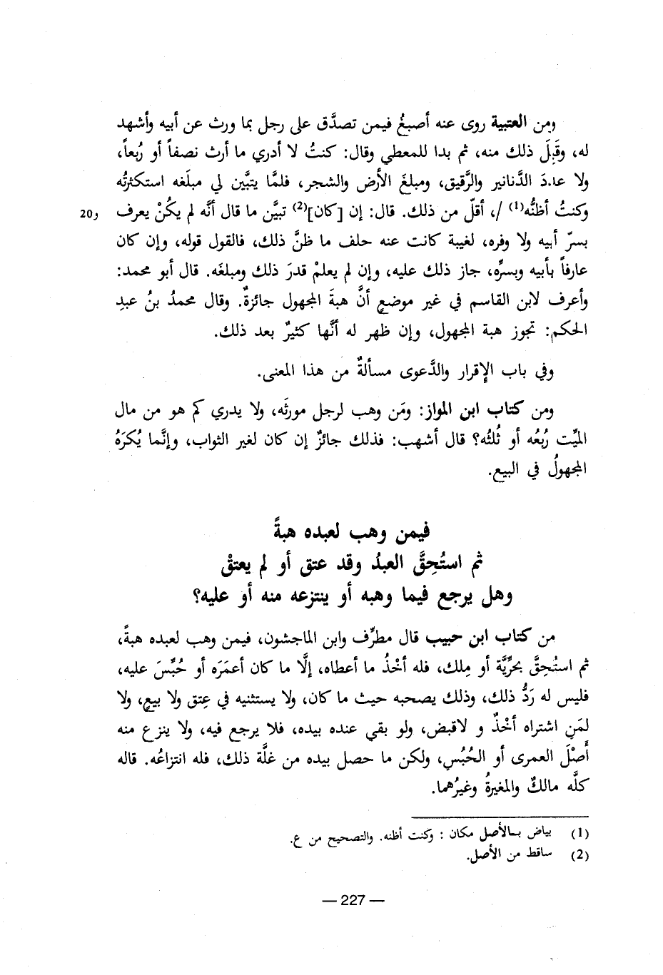ومن العتبية روى عنه أصبغ فيمن تصدق على رجل بما ورث عن أبيه وأشهد له، وقبل ذلك منه، ثم بدا للمعطي وقال: كنت لا أدري ما أرث نصفا أو ربعا، ولا عدد الدنانير والرقيق، ومبلغ الأرض والشجر، فلما يتبين لي مبلغه استكثرته وكنت أظنه (¬1) /، أقل من ذلك. قال: إن [كان] (¬2) تبين ما قال أنه لم يكن يعرف بسر أبيه ولا وفره، لغيبة كانت عنه حلف ما ظن ذلك، فالقول قوله، وإن كان عارفا بأبيه وبسره، جاز ذلك عليه، وإن لم يعلم قدر ذلك ومبلغه. قال أبو محمد: وأعرف لابن القاسم في غير موضع أن هبة المجهول جائزة. وقال محمد بن عبد الحكم: تجوز هبة المجهول، وإن ظهر له أنها كثير بعد ذلك. وفي باب الإقرار والدعوى مسألة من هذا المعنى. ومن كتاب ابن المواز: ومن وهب لرجل مورثه، ولا يدري كم هو من مال الميت ربعه أ, ثلثه؟ قال أشهب: فذلك جائز إن كان لغير الثواب، وإنما يكره المجهول في البيع. فيمن وهب لعبده هبة ثم استحق العبد وقد عتق أو لم يعتق وهل يرجع فيما وهبه أو ينتزعه منه أو عليه؟ من كتاب ابن حبيب قال مطرف وابن الماجشون، فيمن وهب لعبده هبة، ثم استحق بحرية أو ملك، فله أخذ ما أعطاه، إلا ما كان أعمره أو حبس عليه، فليس له رد ذلك، وذلك يصحبه حيث ما كان، ولا يستثنيه في عتق ولا بيع، ولا لمن اشتراه أخذ ولا قبض، ولو بقي عنده بيده، فلا يرجع فيه، ولا ينزع منه أصل العمرى أو الحبس، ولكن ما حصل بيده من غلة ذلك، فله انتزاعه. قاله كله مالك والمغيرة وغيرهما.