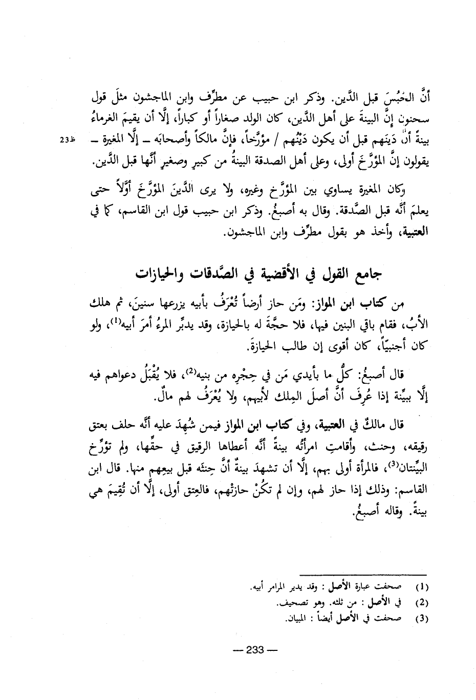 أن الحبس قبل الدين. وذكر ابن حبيب عن مطرف وابن الماجشون مثل قول سحنون إن البينة على أهل الدين، كان الولد صغارا أو كبارا، إلا أن يقيم الغرماء بينة أن دينهم قبل أن يكون دينهم/ مؤرخا، فإن مالكا وأصحابه- إلا المغيرة- يقولون إن المؤرخ أولى، وعلى أهل الصدقة البينة من كبير وصغير أنها قبل الدين. وكان المغيرة يساوي بين المؤرخ وغيره، ولا يرى الدين المؤرخ أولا حتى يعلم أنه قبل الصدقة. وقال به أصبغ. وذكر ابن حبيب قول ابن القاسم، كما في العتبية، وأخذ هو بقول مطرف وابن الماجشون. جامع القول في الأقضية في الصدقات والحيازات من كتاب ابن المواز: ومن حاز أرضا تعرف بأبيه يزرعها سنين، ثم هلك الأب، فقام باقي البنين فيها، فلا حجة له بالحيازة، وقد يدبر المرء أمر أبيه (¬1)، ولو كان أجنبيا، كان أقوى إن طالب الحيازة. قال أصبغ: كل ما بأيدي من في حجره من بنيه (¬2)، فلا يقبل دعواهم فيه إلا ببينة إذا عرف أن أصل الملك لأبيهم، ولا يعرف لهم مال. قال مالك في العتبية، وفي كتاب ابن المواز فيمن شهد عليه أنه حلف بعتق رقيقه، وحنث، وأقامت امرأته بينة أنه أعطاها الرقيق في حقها، ولم تؤرخ البينتان (¬3)، فالمرأة أولى بهم، إلا أن تشهد بينة أن حنثه قبل بيعهم منها. قال ابن القاسم: وذلك إذا حاز لهم، وإن لم تكن حازتهم، فالعتق أولى، إلا أن تقيم هي بينة وقاله أصبغ.