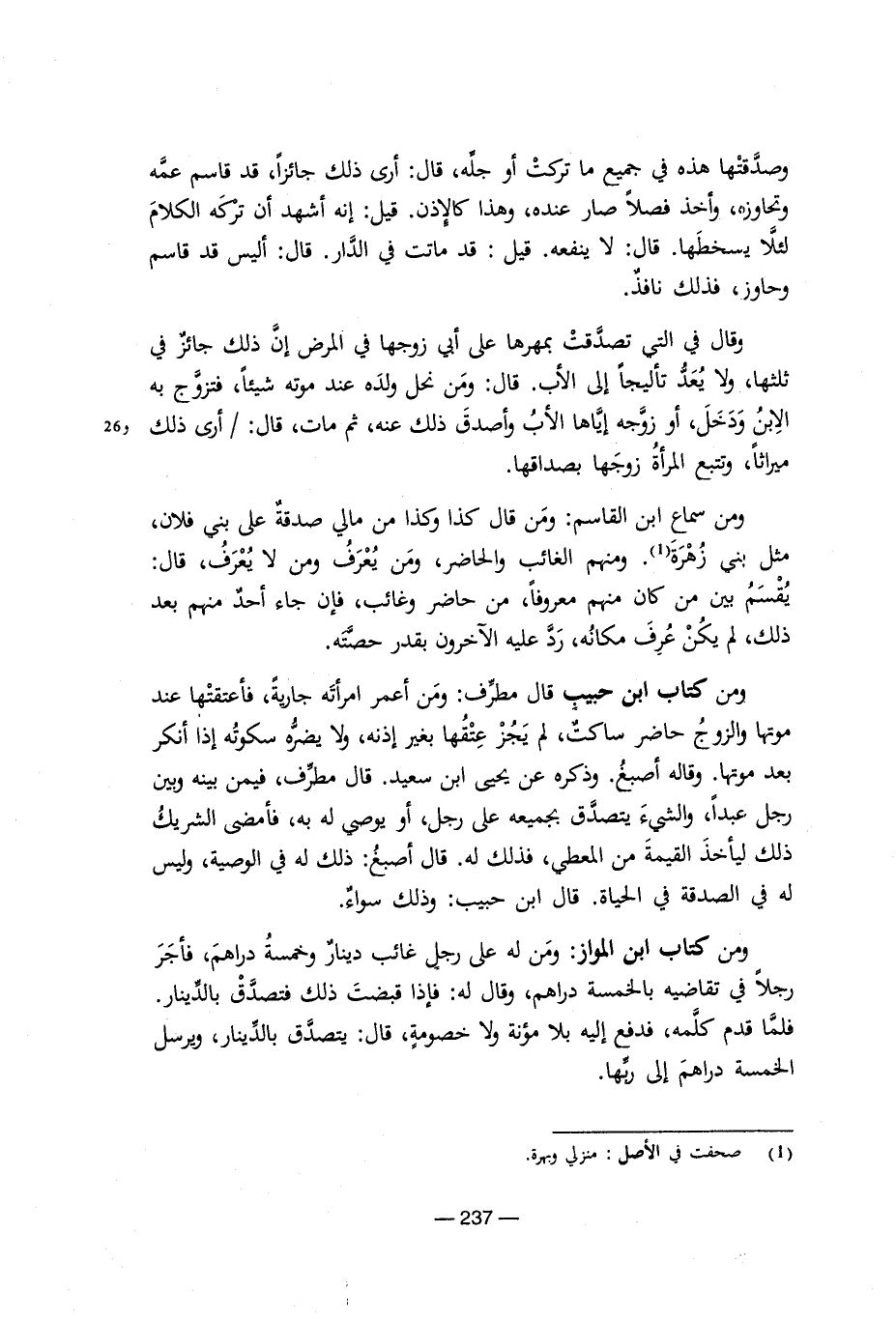 وصدقتها هذه في جميع ما تركت أو جله، قال: أرى ذلك جائزا، قد قاسم عمه وتحاوزه، وأخذ فصلا صار عنده، وهذا كالإذن. قيل: إنه أشهد أن تركه الكلام لئلا يسخطها. قال: لا ينفعه. قيل: قد ماتت في الدار. قال: أليس قد قاسم وحاوز، فذلك نافذ. وقال في التي تصدقت بمهرها على أبي زوجها في المرض إن ذلك جائز في ثلثها، ولا يعد تأليجا إلى الأب. قال: ومن نحل ولده عند موته شيئا، فتزوج به الابن ودخل، أو زوجه إياها الأب وأصدق ذلك عنه، ثم مات، قال:/ أرى ذلك ميراثا، وتتبع المرأة زوجها بصداقها. ومن سماع ابن القاسم: ومن قال كذا وكذا من مالي صدقة على بني فلان، مثل بني زهرة (¬1). ومنهم الغائب والحاضر، ومن يعرف ومن لا يعرف، قال: يقسم بين من كان منهم معروفا، من حاضر وغائب، فإن جاء أحد منهم بعد ذلك، لم يكن عرف مكانه، رد عليه الآخرون بقدر حصته. ومن كتاب ابن حبيب قال مطرف: ومن أعمر امرأته جارية، فأعتقتها عند موتها والزوج حاضر ساكت، لم يجز عتقها بغير إذنه، ولا يضره سكوته إذا أنكر بعد موتها. وقاله أصبغ. وذكره عن يحيى ابن سعيد. قال مطرف، فيمن بينه وبين رجل عبدا، والشيء يتصدق بجميعه على رجل، أو يوضي له به، فأمضى الشريك ذلك ليأخذ القيمة من المعطي، فذلك له. قال أصبغ: ذلك له في الوصية، وليس له في الصدقة في الحياة. قال ابن حبيب: وذلك سواء. ومن كتاب ابن المواز: ومن له على رجل غائب دينار وخمسة دراهم، فأجر رجلا في تقاضيه بالخمسة دراهم، وقال له: فإذا قبضت ذلك فتصدق بالدينار. فلما قدم كلمة، فدفع إليه بلا مؤنة ولا خصومة، قال: يتصدق بالدينار، ويرسل الخمسة دراهم إلى ربها.