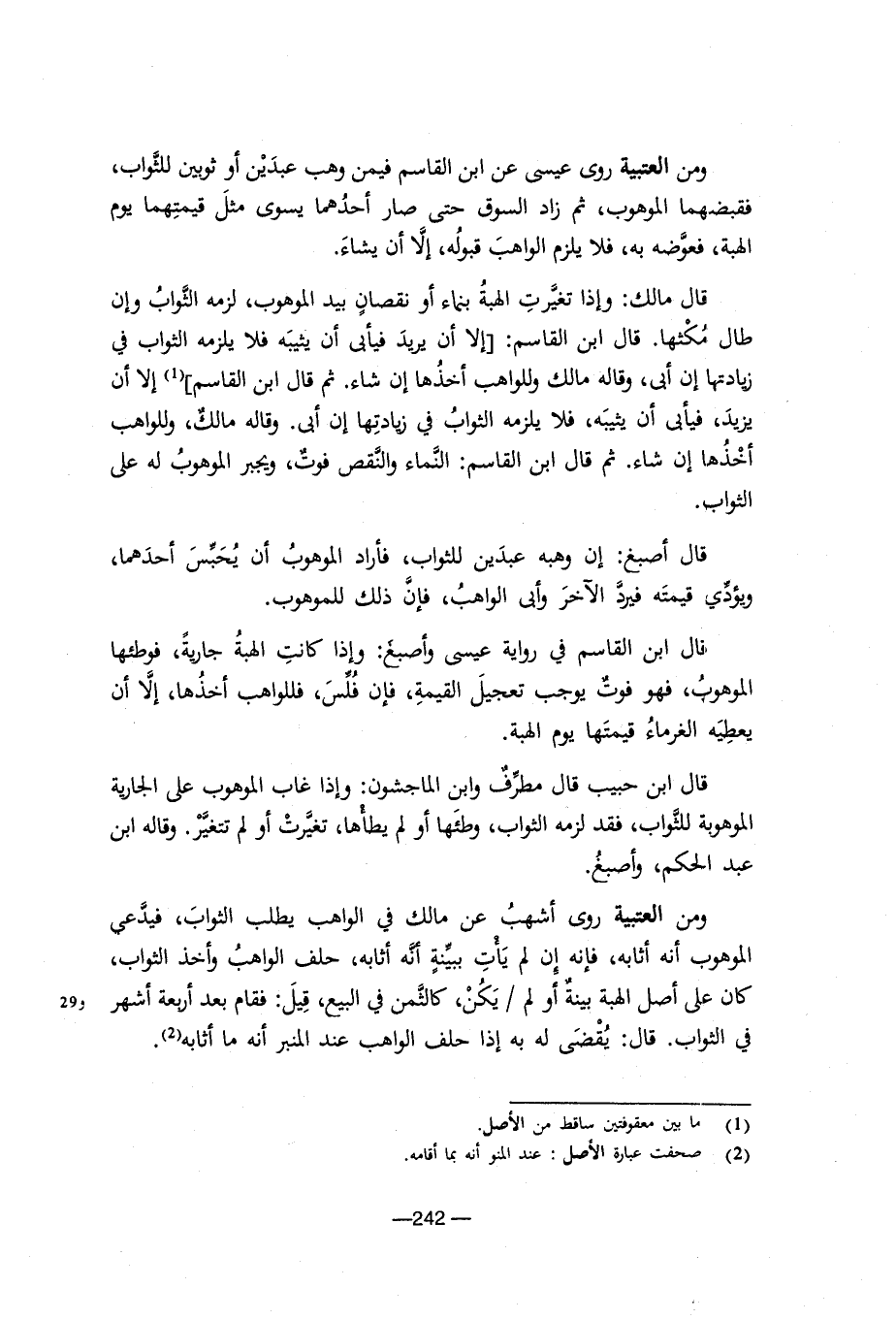 ومن العتبية روى عيسى عن ابن القاسم فيمن وهب عبدين أو ثوبين للثواب, فقبضهما الموهوب, ثم زاد السوق حتى صار احدهما يسوى مثل قيمتهما يوم الهبه, فعوه به, فلا يلزم الواهب قبولله, إلا أن يشاء قال مالك: وإذا تغيرت الهبه بنماء أو نقصان بيد الموهوب, لزمه الثواب وإن طال مكثها. قال ابن القاسم: [إلا أن يريد فيأبى ان يثيبه فلا يلزمه الثواب فى زيادتها إن أبى, وقاله مالك وللواهب أخذها إن شاء. ثم قال ابن القاسم] (¬1) إلا أن يزيد, فيأبى أن يثيبه, فلا يلزمه الثواب فى زيادتها إن ابى. وقاله مالك, وللواهب أخذها إن شاء. ثم قال ابن القاسم: النماء والنقص فوت, ويجبر الموهوب له على الثواب. قال أصبغ: إن هبة عبدين للثواب, فأراد الموهوب أن يحبس أحدهما, ويودى قيمته فيرد الاخر وأبى الواهب, فإن ذلك للموهوب. قال ابن القاسم فى رواية عيسى وأصبغ: وإذا كانت الهبة جارية, فوطئها الموهوب، فهو فوت يوجب تعجيل القيمة, فإن فلس, فللواهب أخذها, إلا ان يعطيه الغرماء قيمتها يوم الهبة. قال ابن حبيب قال مطرف وابن الماجشون: وإذا غاب الموهوب عللى الجارية الموهوبة للثواب, فقد لزمه الثواب, وطئها أو لم يطأها, تغيرت أو لم تتغير. وقاله ابن عبد الحكم, وأصبغ. ومن العتبية روى أشهب عن مالك فى اللواهب يطلب الثواب, فيدعى الموهوب أنه أثابه، فإنه إن لم يأت ببنية انه أثابه, حلف الواهب وأخذ وأخذ الثواب, كان على أصل الهبة بنية أو لم/ يكن, كالثمن فى البيع, قيل: فقام بعد أربعة أشهر فى الثواب. قال: يقضى له به إذا حلف الواهب عند المنبر أنه ما أثابه (¬2)