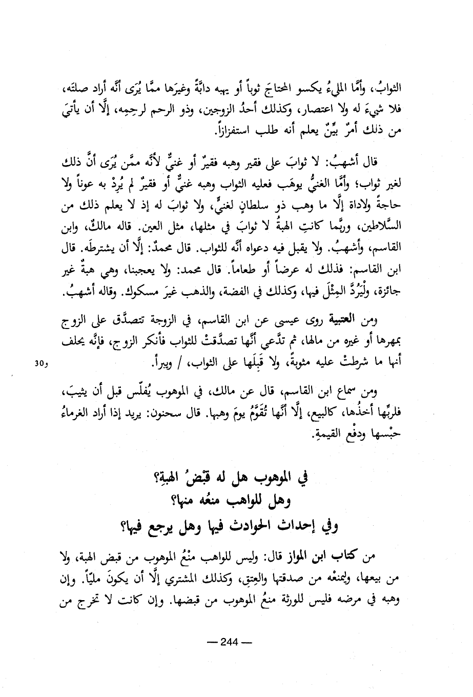 الثواب, أما الملى يكسو المحتاج ثوبا أو يهبه دابة وغيرها مما يرى أنه أراد صلته, فلا شىء له ولا اعتصار, وكذلك أحد الزوجين, وذو الرحمة لرحمه, إلا أان ياتى من ذلك أمر بيين يعلم أنه طلب استفزازا. قال أشهب: لا ثزاب على فقير وهبه فقير أو غنى لانه ممن يرى ان ذللك لغير ثواب؛ وأما يوهب فعليه الثواب وهبة غنى او فقير لم يرد به عونا ولا حاجة ولاداة إلا ما وهب ذو سلطان لغنى, ولا ثواب له إذ لا يعلم ذلك من السلاطين, وربما كانت الهبة لا ثواب فى مثلها, مثل العين. قالله مالك, وابن القاسم, وأشهب. ولا يقبل فيه دعواه أنه للثواب. قال محمد: إلا أن يشترطه. قال ابن القاسم: فذلك له عرضا أو طعاما. قال محمد: ولا يعجببنا, وهى هبة غير جائزة, وليرد المثل فيها, وكذلك فى الفضة, والذهب غير مسكوك. وقاله أشهب. ومن العتبية روى عيسى عنابن القاسم, فى الزوجة تتصدق علحى الزوج بمهرها أو غيره من مالها, ثم تدعى أنها تصدقت للثواب فأنكر الزوج فإنه يحلف أنها ما شرطت عليه مثوبة, ولا قبلها على الثواب,/ ويبرأ ومن سماع ابن القاسم, قال عن مالك, فى الموهوب يفلس قبل أن يثيب, فلربها أخذها, كالبييع, إلا أنها تقوم يوم وهبها. قال ابن سحنون: يريد إذا أراد الغرماء حسبها ودفع القيمة. فى المواهب هل للواهب منعه منها؟ وفى إحداث الحوادث فيها يرجع فيها؟ من كتاب ابن المواز قال: ليس للواهب منع الموهوب من قبض الهبة, ولا من بيعها, وليمنعه من صداقتها والعتق, وكذلك المشترى إلا أن يكون مليا. وإن وهبة فى مرضه فليس للورثة منع الموهوب من قبضها. وإن كانت لا تخرج