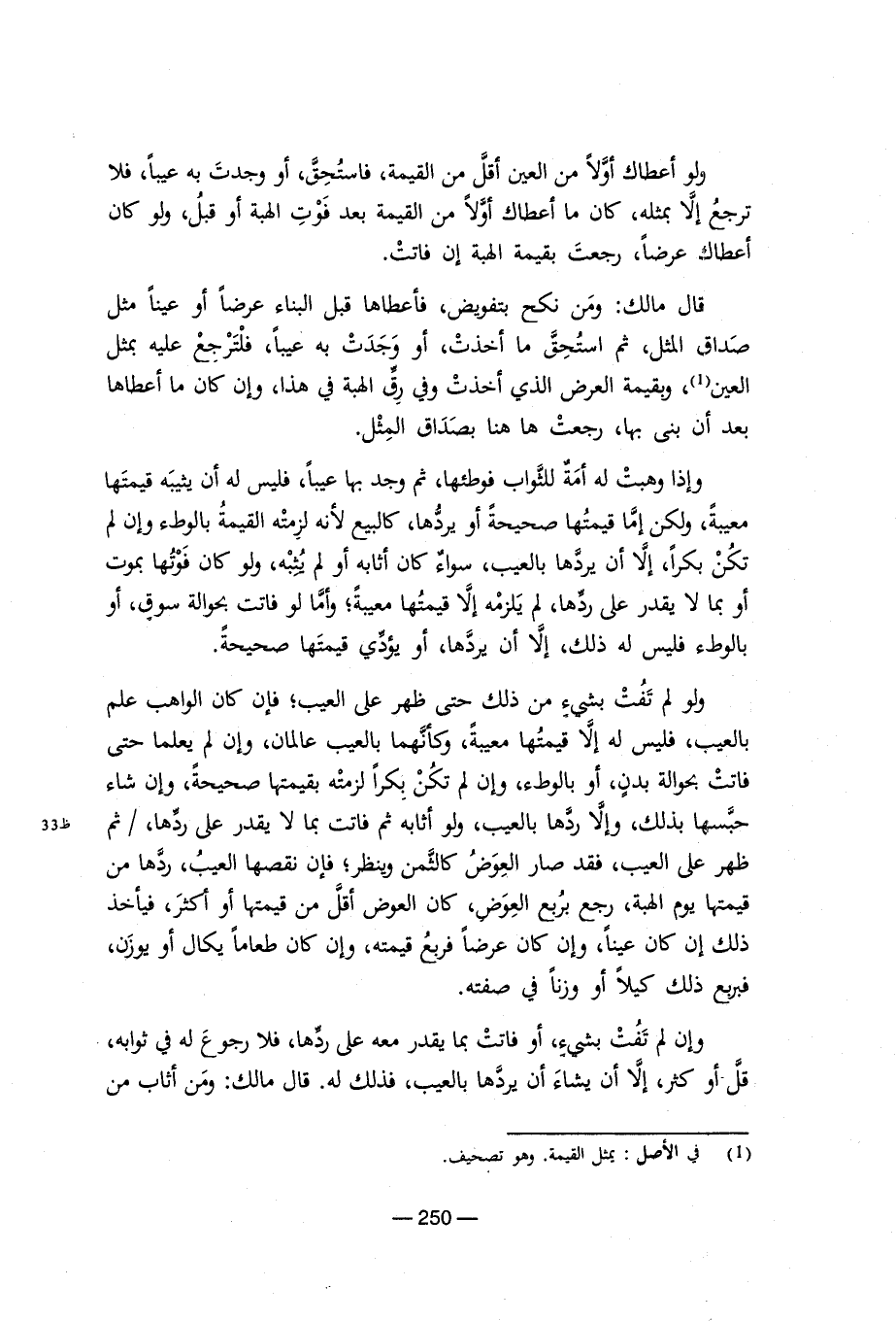 ولو أعطاك أولا من العين أقل من القيمة، فاستحق، أو وجدت به عيبا، فلا ترجع إلا بمثله، كان ما أعطاك أولا من القيمة بعد فوت الهبة أو قبل، ولو كان أعطاك عرضا، رجعت بقيمة الهبة إن فاتت. قال مالك: ومن نكح بتفويض، فأعطاها قبل البناء عرضا أو عينا مثل صداق المثل، ثم استحق ما أخذت، أو وجدت به عيبا، فلترجع عليه بمثل العين (¬1)، وبقيمة العرض الذي أخذت وفي رق الهبة في هذا، وإن كان ما أعطاها بعد أن بنى بها، رجعت ها هنا بصداق المثل. وإذا وهبت له أمة للثواب فوطئها، ثم وجد بها عيبا، فليس له أن يثيبه قيمتها معيبة، ولكن إما قيمتها صحيحة أو يردها، كالبيع لأنه لزمته القيمة بالوطء وإن لم تكن بكرا، إلا أن يردها بالعيب، سواء كان أثابه أو لم يثبه، ولو كان فوتها بموت أو بما لا يقدر على ردها، لم يلزمه إلا قيمتها معينة؛ وأما لو فاتت بحوالة سوق، أو بالوطء فليس له ذلك، إلا أن يردها، أو يؤدي قيمتها صحيحة. ولو لم تفت بشيء من ذلك حتى ظهر على العيب؛ فإن كان الواهب علم بالعيب، فليس له إلا قيمتها معيبة، وكأنهما بالعيب عالمان، وإن لم يعلما حتى فاتت بحوالة بدن، وإلا ردها بالعيب، ولو أثابه ثم فاتت بما لا يقدر على ردها،/ ثم ظهر على العيب، فقد صار العوض كالثمن وينظر؛ فإن نقصها العيب، ردها من قيمتها يوم الهبة، رجع بربع العوض، كان العوض أقل من قيمتها أو أكثر، فيأخذ ذلك إن كان عينا، وإن كان عرضا فربع قيمته، وإن كان طعاما يكال أو يوزن، فبربع ذلك كيلا أو وزنا في صفته. وإن لم تفت بشيء، أو فاتت بما يقدر معه على ردها، فلا رجوع له في ثوابه، قل أو كثر، إلا أن يشاء أن يردها بالعيب، فذلك له. قال مالك: ومن أثاب من