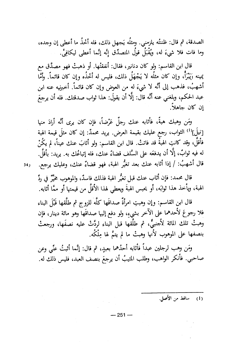 الصدقة , ثم قال: ظننته يلزمنى. ومثلُة يجهل ذلك , فلة أخذُ ما أعطى إن وجدخ , وما فات فلا شيء , ويقبل قول المتصّدق إنه إنما أعطى ليكافيء. قال ابن القاسم: ولو كان دنانير , فقال: أنفقتها. أو ذهبت فهو مصدق مع يمينة ويبرأ , وإن كان مثله لا يجهل ذلك , فليس لة أخذة وغن كان قائما. وأما أشهب , فذهب الى أنه لا شيئ له من العوض وإن كان قائما. أخبرية عنة ابن عبد الحكم , وبلغنى عنه أنة قال: الا يقول: هذا ثواب صدقتك. فلة أن يرجع إن كان جاهلا. ومن وهبك هبة , فأثابة عنك رجل عرضا , فإن كان يرى انة أراد منها (نيل) (¬1) الثواب , رجع عليك بقيمة العرض. يريد محمد: ان كان مثل قيمة الهبة فأقل , وقد كانت الهبة قد فاتت. قال ابن القاسم: ولو أثاب عنك عينا , لم يكن فيه ثواب , إلا أن يدفعة على السلف قضاء عنك , فلة إتباعك به. يريد: بأقل قال أشهب:/ إذا أثابه عنك قبل بعد تغير الهبة , فهو قضاء عنك , وعليك يرجع. قال محمد: فإن أثاب عنك قبل تغير الهبة ويعطى لهذا الأقل من قيمتها أو مما أثابة. قال ابن القاسم: وإن وهبت امرأة صداقها كلة للزوج ثم طلقها قبل البناء فلا رجوع لاحدهما على الآخر بشيء ولو دفع اليها صداقها وهو مائة دينار , فإن وهبت تلك المائة لاجنبى , ثم طلقها قبل البناء لردت علية نصفها , ورجعت بنصفها على الموهوب لأنها وهبت ما لم يتم لها ملكه. ومن وهب لرجلين عبدا فأثابة أحدهما بعبد , ثم قال: إنما أثبت عنى وعن صاحبى. فأنكر الواهب ,وطلب المثيب أن يرجع بنصف العبد , فليس ذلك له.