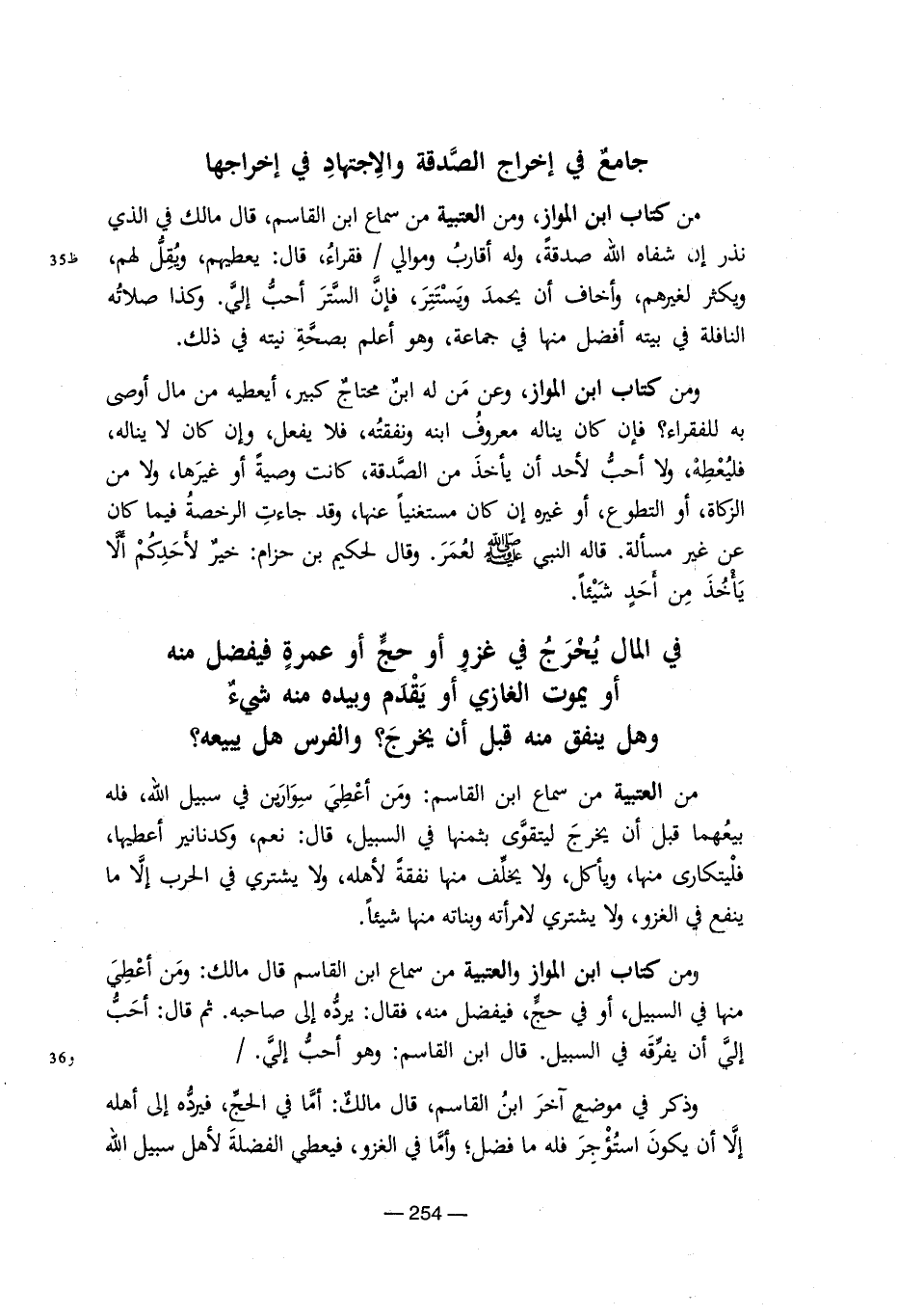 جامع في إخراج الصدقة والاجتهاد فى إخراجهامن كتاب أبو المواز, ومن العتبية من سماع ابن القاسم, قال مالك فى الذى نذرإن شفاه الله صدقة, وله أقارب وموالى/ فقراء, قال: يعطيهم, ويقل لهم ويكثر لغيرهم, وأخاف أن يحمد ويستتر, فان الستر أحب الى. وكذا صلاته النافلة فى بيتة أفضل منه فى جماعة, وهو أعلم بصحة نيتة فى ذلك. ومن كتاب ابن المواز, وعن من لة ابن محتاج كبير, أيعطة من مال أوصى به الفقراء؟ فإن كان يناله معروف ابنة ونفقتة, فلا يفعل, وإن كان لا يناله, فليعطة, ولا أحب لاحد أن يأخذ من الصدقة, كانت وصية أو غيرها, ولا من الزكاه, أو التطوع, أو غيره إن كان مستغنيا عنها, وقد جاءت الرخصة فيما كان عن غير مسألة. قال النبى صلى الله علية وسلم لعمر. وقال لحكيم بن حزام: خير لاحدكم ألايأخذ من أحدا شيئا. في المال يخرج في غزو او حج أو عمرة فيفضل منه أو يموت الغازى أو يقدم وبيده منه شيء وهل ينفق منه قبل أن يخرج؟ والنفس بيعية؟ من التبعية من سماع ابن القاسم: ومن اعطى سوارين فى سبيل الله, فله بيعها قبل أن يخرج ليتقوى بثمنها فى السبيل, قال: نعم, وكدنانيز أعطيها, فليتكارى منها, ولايخلف منها نفقة لاهلة, ولا يشترى فى الحرب إلا ما ينفع فى الغزو, ولا يشترى لامراتة وبناتة منها شيئا. ومن كتاب ابن المواز والعتبية من سماع ابن القاسم قال مالك: ومن اعطى منها فى السبيل. قال ابن القاسم: وهو أحب الى./ وذكر فى موضع آخر ابن القاسم, قال مالك: أما فى الحج, فيردة الى أهلة إلا أن يكون استؤجر فلهما فضل؛ وأما فى الغزو, فيعطى الفضلة لاهل سبيل الله