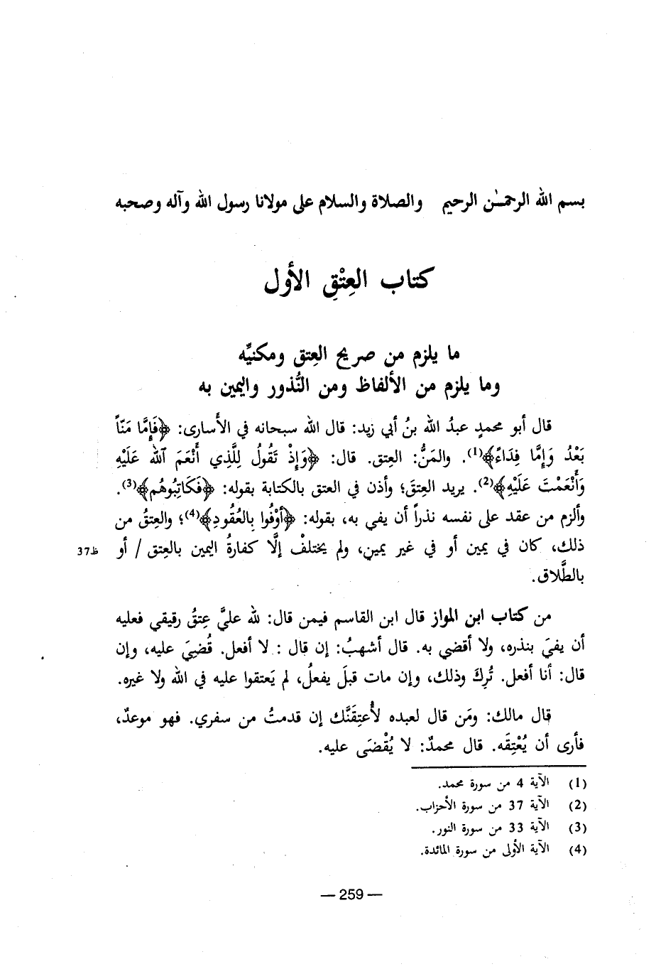 ما يلزم من صرييح العتق ومكنيه وما يلزم من الالفاظ ومن النذور واليمين قال أبو محمد عبد الله بن أبى زيد: قال سبحانة فى الاسارى: {فإما منا بعد وإما فداء} (¬10). والمن: العتق. قال: {وإذا تقول للذى أنعم الله عليه وأنعمت عليه} (¬11). يريد العتق؛ قال: {فكاتبوهم} (¬12). وألزم من عقد على نفسه نذرا أن يفى به, بقوله: {أفوا بالعقود} (¬13)؛ والعتق من ذلكو كان فى يمين أو فى غير يمين, ولم يختلف إلا كفارة اليمين بالعتق/ أو بالطلاق. ومن كتاب ابن المواز قال ابن القاسم فيمنقال: على عتق رقيقى فعليه أن يفى بنذرة, ولا أقضى به. قال أشهب: لا أفعل. قضى علية, وإن قال: انا أفعل. ترك وذلك, وإن مات قبل, لم يعتقوا علية فى الله ولا غيره. قال مالك: ومن قال لعبده لاعتقنك إن قدمت من سفرى. فهو موعد, فأرى أن يعتقه. قال محمد: لا يقضى عليه.