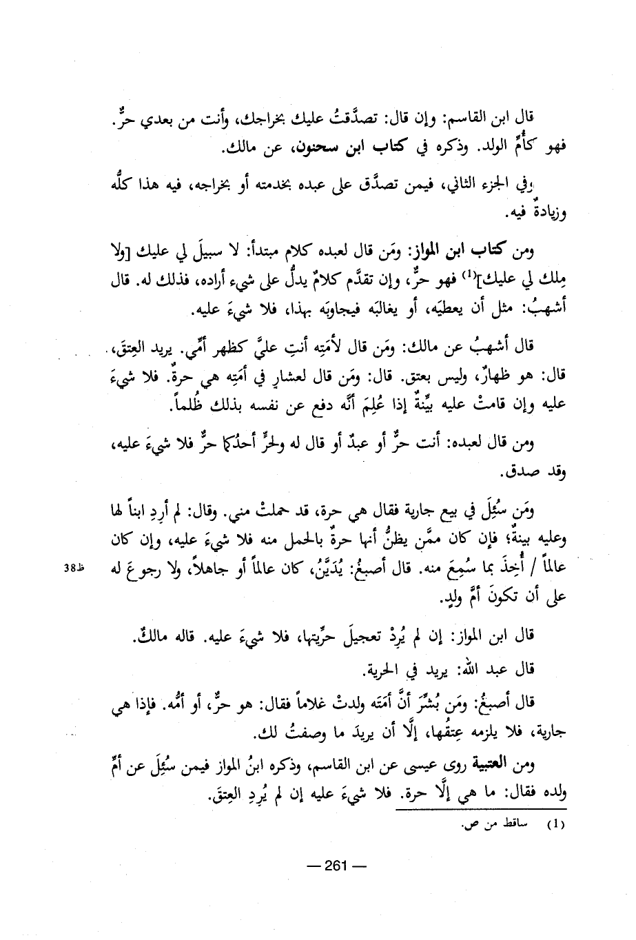 قال ابن القاسم: وإن قال: تصدقت عليك بخراجك, وأنت من بعدى حر. فهو كأم الوالد. وذكره فى كتاب ابن سحنون, عن مالك. وفى الجزء الثانى, فيتصدق على عبدة بخدمة أو بخراجة, فيه هذا كلة وزيادة فية. ومن كتاب ابن المواز: ومن قال لعبدة كلام مبتدأ: لا سبيل لى عليك (ولا ملك لى عليك) (¬18) فهو حر, وإن تقدم كلام يدل على شيء أرادة, فذلك له. قال أشهب: مثل أن يعيطيه, أو يغالبه فيجاوبه بهذا, فلا شيء عليه. قال أشهب عم مالك: ومن قال لأمته أنت على كظهر أمى. يريد العتق, قال: هو ظهار, وليسبعتق. قال: ومن قال لعشار فى أمته هى حره. فلا شيء عليه وإن قامت عليه بينه إذا عللم انه دفع عن نفسه بذلك ظلما. ومن قال لعبده: أنت حر أو عبد أو قال والحر أحدكما حر فلا شيء عليه, وقد صدق. ومن سئل فى بيع جارية فقال هى حرة, قد حملت منى. وقال لم أرد ابنا لها وعليه بينة؛ فإن كان ممن يظن أنها حره بالحمل منة فلا شيء عليه, وإن كان عالما/ أخذ بما سمع منه. قال أضبغ: يدين, كان عالما أو جاهلا, ولا رجوع له على أن تكون أم ولد. قال ابن المواز: عن لم يرد تعجيل حريتها, فلا شيء عليه. قال مالك. قال عبد الله: يريد الحرية. وقد أصبغ: ومن بشر أن أمته ولدت غلاما فقال: هو حر, أو أمه. فإذا هى جارية, يلزمةعتقها, إلا أن يريد ما وصفت لك. ومن التبعية روى عيسى عن ابن القاسم, وذكره ابن المواز فيمن سئل عن أم ولده فقال: ما هى إلا حرة. فلا شيء عليه إن لم يرد العتق.