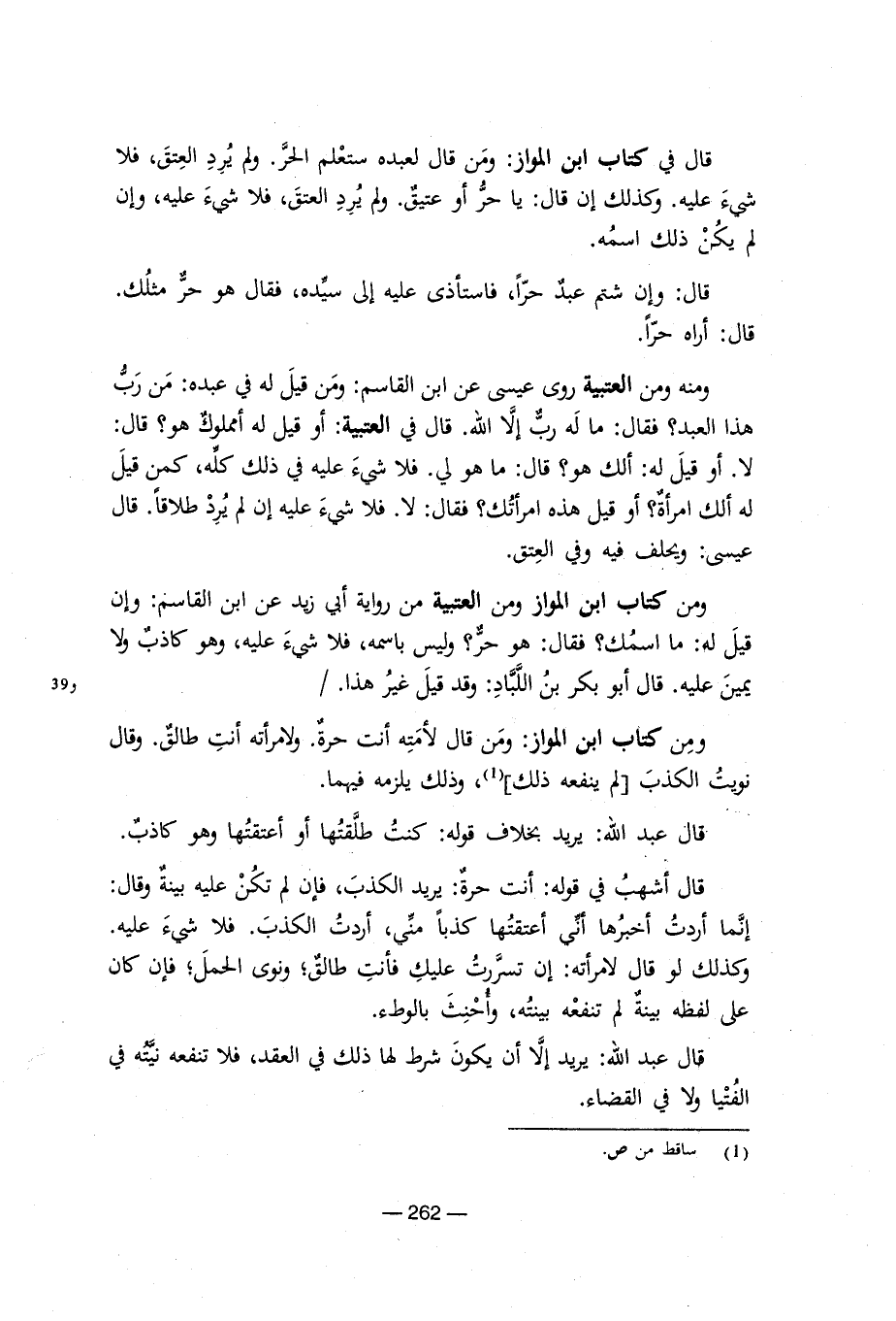 قال في كتاب ابن المواز: ومن قال لعبده ستعلم الحر. ولم يرد العتق, فلا شيئ عليه. وكذلك إن قال: ياحر أو عتيق. ولم يرد العتق, فلا شىء عليه, وإن لم يكن ذلك اسمه. قال: وغن شتم عبد حرا, فاستأذى عليه إلى سيده, فقال حر مثلك. قال: أراه حرا. ومن العتبية: أو قيل له أمملوك هو؟ قال: لا. أو قيل له: ألك هو؟ قال: ما هو لى. فلا شىء عليه فى ذلك كله, كمن قيل له الكامرأه؟ او قيل هذة امراتك؟ فقال: لا. فلا شىء عليه إن لم يرد طلاقا. قال عيسى: ويحلف فيه وفى العتق. ومن كتاب ابن المواز ومن العتبية من رواية أبى زيد عن ابن القاسم: وإ ن قيل له: ما اسمك؟ فقال: هو حر؟ وليس باسمة, فلا شيء عليه, وهو كاذب ولا يمين عليه. قال أبو بكر بن اللباد: وقد غير هذا./ ومن كتاب النواز: ومن قال لامته انت حرة. ولامرأته أنت طالق. وقال نويت الكذب (لم ينفعه ذلك) (¬19) , وذلك يلزمه فيهما. قال عبد الله: يريد بخلاف قوله: كنت طلقتها او عتقتها وهو كاذب. قال أشهبفى قوله: انت حرة: يريد الكذب, فإن لم تكن عليو بينه وقال: إنما أردت اخبرها أنى أعتقتها كذبامنى, واردت الكذب. فلا شىءعليه. وكذلك لو قال لامرأتة: إن تسرت عليك فأنت طالق؛ ونوى الحمل؛ فإن كان على لفظه بينة لم تنفعه بينته, وأحنث بالوطء قال عبد الله: يريد إلا ان يكون شرط لها ذلك فى العقد, فلا تنفعه نيته فى الفتيا ولا فى القضاء.