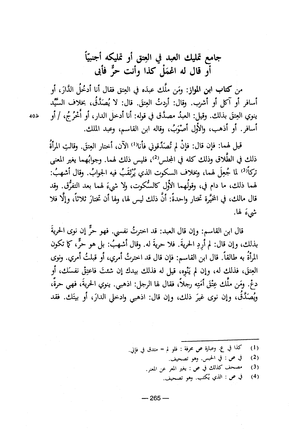 جامع تمليك العبد فى العتق أو تمليكه أجنبيا أو قال لة اعمل كذا وأنت حر فأبى منم كتاب ابن المواز: ومن ملك عبده فى العتق فقال أنا ادخل الدار, أو أسافر أو آكل أو أشرب. وقال: أردت العتق. قال: لا يصدق, ببخلاف السيد ينوى العتق بذلك. وقيل: العبد مصدق فى قوله: أنا أدخل الدار, أو أخرج,/ أو أسافر. أو أذهب, والاول أصوب, وقال ابن القاسم, وعبد الملك. قاللهما: فإن قال: فإن لم تصدقونى فأنا الان, أختار العتق. وقالت المرأة ذلك فى الطلاق وذلك كله فى المجلس فليس ذلك لهما. وجوابهما بغير المعنى تركا ولما جعل لهماغ, وبخلاف السكوت الذى يرتقب فيه الجواب. وقال أشهب: لهما ذلك, ما دام فى , وقولهما الاول كالسكوت, ولا شيء لهما بعد التفرق. وقد قالمالك, فى المخيرة تختارواحدة: ان ذلك ليس بها, أن تختار ثلاثا, وإلا فلا شىء لها. قال ابن القاسم: وإن قال العبد: قد اخترت نفسى. فهو حر إن نوى الحرية بذلك, وإن قال: لم أرد الحرية. فلا حرية له وقال أشهب: بل هو حر, كما تكون المرأةالمطلقةبه طالقا. قال ابن القاسم: فإن قال قد اخترت أمرى, أو قبلت أمرى. ونوى العتق, فذلك له, وغن لم ينوه, قيل له ذلك بيدك عن شئات فاعتق نفسك, أو دع. ومن ملك عتق أمته رجلا, فقال لها الرجل: اذهبى. ينوى الحرية, فهى حرة, ويصدق , وإن نوى غير ذلك, وإن قال: اذهبى وادخلى الدار, أو بيتك. فقد