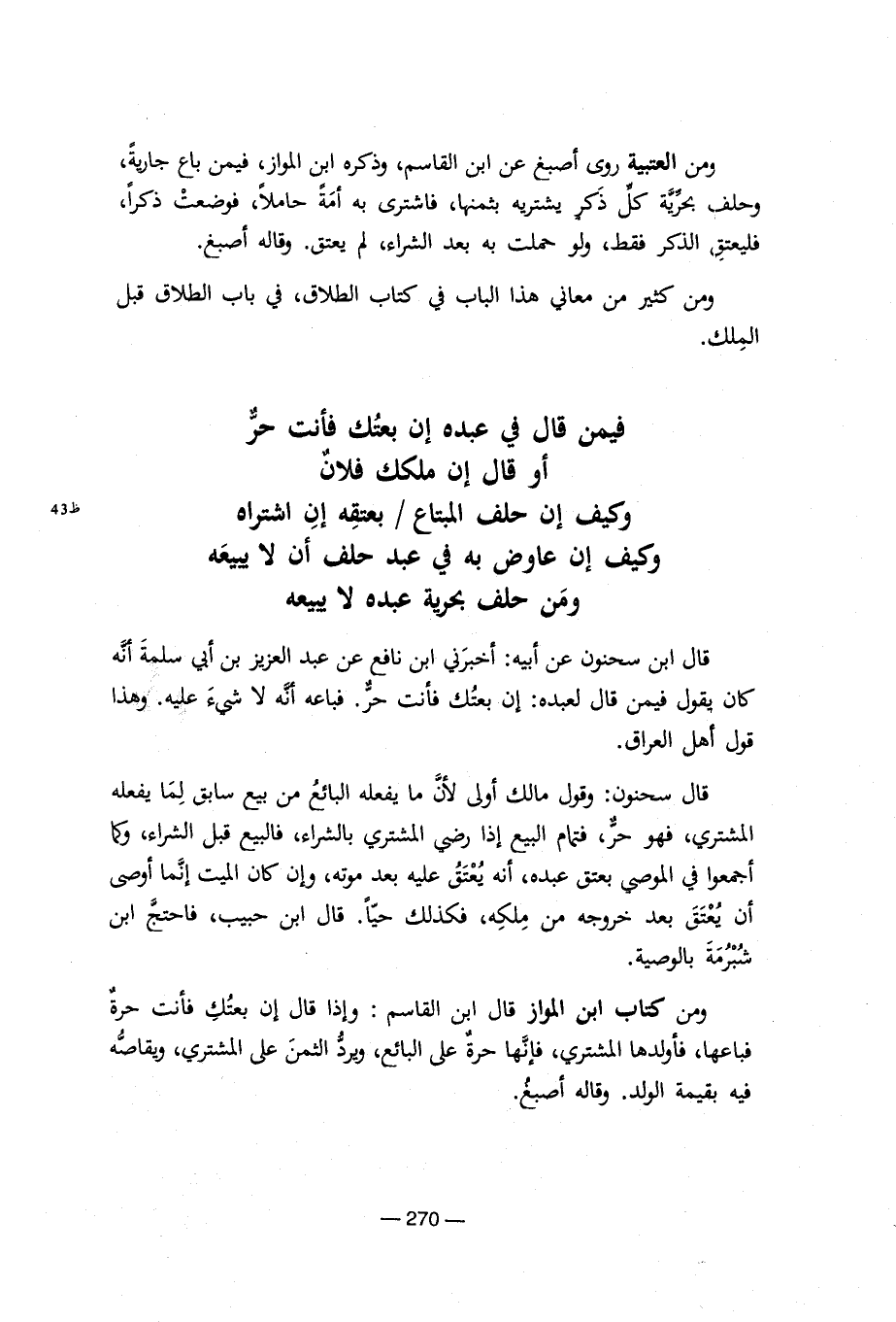 ومن العتبية روى أصبغ عن ابن القاسم, وذكره ابن المواز, فيمن باع جارية, وحلف بحريه كل ذكر يشتريه بثمنها, فاشترى به أمه حاملا, فوضعت ذكرا, فليتعق الذكر فقط, ولو حمت به بعد شراء, لم يعتق. وقاله أصبغ. ومن كثير من معانى هذا الباب فى كتاب الطلاق, في باب الطلاق قبل الملك. فيمن فالعبده إن بعتك فأنت حر أو قال إن ملكك فلان إن عاوض به في عبد حلف أن لايبيعه ومن حلف بحريه عبده لا يبيعه