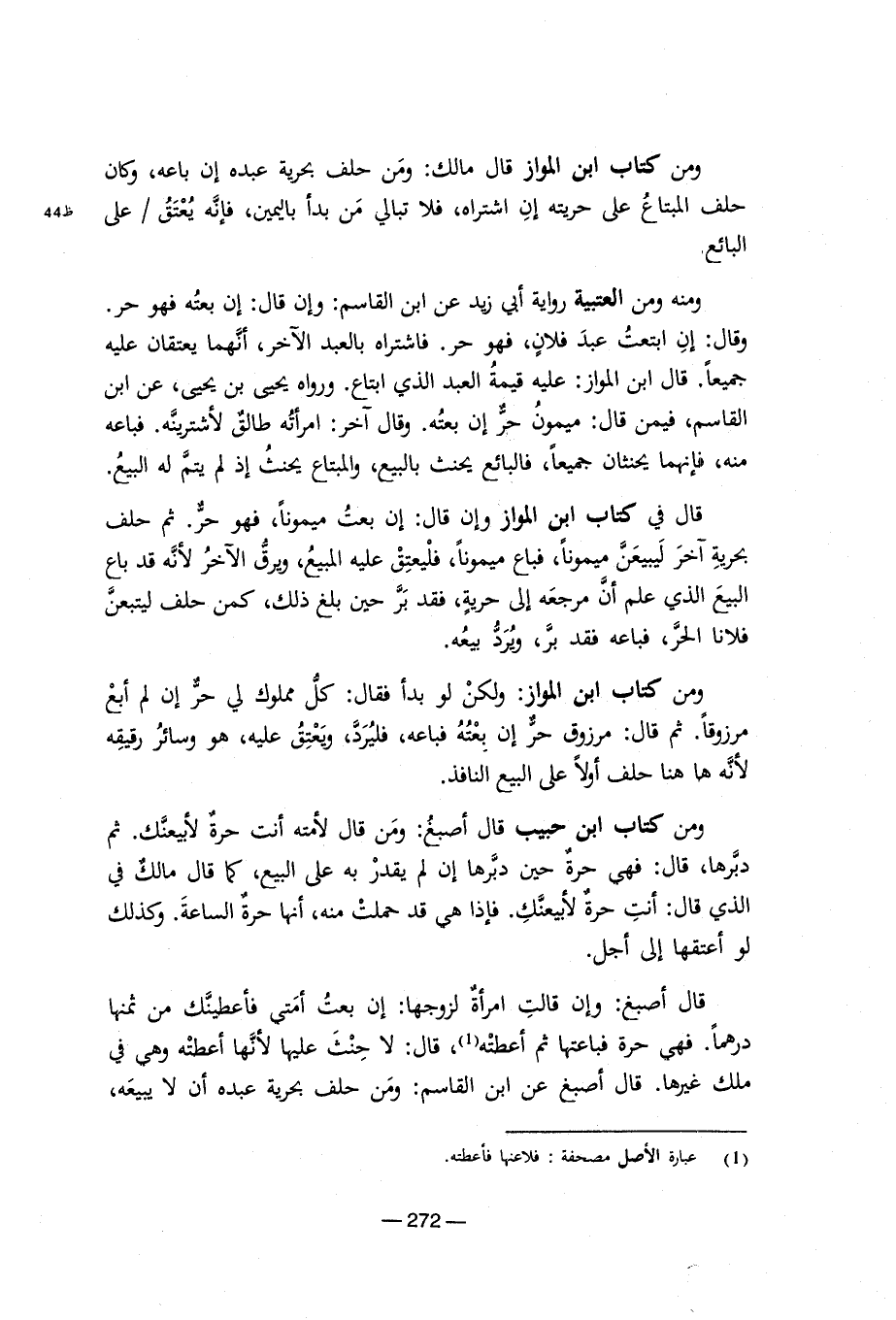 ومن كتاب ابن المواز قال مالك: ومن حلف بحرية عبده إن باعة, وكان حلف المبتاع على حريته عن شاءاشتراه, فلا تبالى من بدأ باليمين, فإنه يعتق/ على البائع ومنه ومن العتبية رواية أبى زيد عن القاسم: وإن قال: إن بعته فهو حر. وقال: إن ابتعت عبد فلان فهو حر. فاشتراه بالعبد الآخر, أنهما يعتقان عليه جميعا. قال ابن المواز: عليه قيمه العبد الذى ابتاع. ورواه يحيى بن يحيى, عن ابن القاسم, فيمن قال: ميمون حر إن بعته. وقال آخر: امرأته طالق لأشترينه. فباعة منه, فإنهما يحنثان جميعا, فالبائع يحنث بالبيع, والمبتاع يحنث إذلم يتم له البيع. قال فى كتاب ابن المواز وإن قال: إن بعت ميمونا, فهو حر. ثم حلف بحرية آخر ليبيعن ميمونا, فباع ميمونا, فليعتق عليه المبيع, ويرق لآخر لأنه قد باع البيع الذى علم أن مرجعة إلى حرية, فقد بر حين بلغ ذلك, كمن حلف ليبتعن فلانا الحر, فباعة فقد بر, ويرد بيعه. ومن كتاب ابن المواز: ولكن بدأ فقال: كل مملوك لي إن لم أبع مرزوقا. ثم قال: مرزوق حر إن بعته فباعه, فليرد ويعتق عليه, وهو سائر رقيقة لأنه ها هنا حلف أولا على البيع النافذ. ومن كتاب ابن حبيب قال أصبغ: ومن قال لأمته أنت حرة لابيعنك. ثم دبرها, قال: فهى حرة حين دبرها إن لم يقدر به على البيع, كما قال مالك فى الذى قال: أنت حرة لابيعنك. فاذا هى قد حملت منه, أنها حرة الساعة. وكذلك لو أعتقها إلى رجل. قال أصبغ: وإن قالت امرأة لزوجها: إن بعت أمتى فاعطيتك من ثمنها درهما. فهى حرة فباعتها ثم أعطيتة (¬1) , قال: لا حنث عليها لانها أعطيته وهى في ملك غيرها. قال أصبغ عن ابن القاسم: ومن حلف بحريه عبد أن لا بيعة