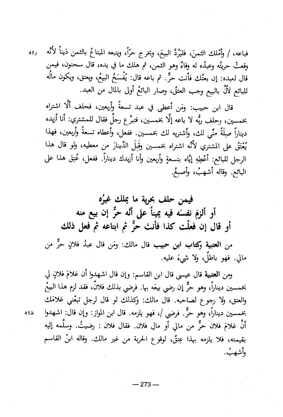 فباعة/ واملك الثمن, فليرد البيع, ويخرج حرا, ويتبعه المبتاع بالثمن دينا لأنه وقعت حريتة وعبدة له وفاء وهو الثمن, ثم هلك ما يده, قال سحنون, فيمن قال لعبدة: إن بعتك فأنت حر. ثم باعه قال: يفسخ البيع, ويعتق ويكون ماله للبائع لأن بالبيع وجب العتق, وصار البائع أولى بالمال من العبد. قال ابن حبيب: ومن أعطى فى عبد تسعه وأربعين, فحلف ألا اشتراه بخمسين, وحلف ربه لا باعه إلا بخمسين, فتبرع رجل فقال المشترى: أنا أزيده دينارا صلة منى لك, وأشتيه لك بخمسين. ففعل. وأعطاه تسعة وأربعين, فهذا يعتق على المشترى لنه اشتراه بخمسين وقبل الدينار من معطيه, ولو قال هذا الرجل للبائع: أعطه إبياه بتسعة وأربعين وأنا أزيدك دينارا. ففعل, عتق هذا على البائع. وقاله أشهب, وأصبغ. فيمن حلف بحرية ما يملك غيرة أو ألزم نفسه فيه يمينا على أنه حر إن بيع منه أو قال إن فعلت كذا فانت حر ثم ابتاعة ثم فعل ذلك من العتبية وكتاب ابن حبيب قال مالك: ومن قال عبد فلان حر من مالى. فهو باطل, ولا شىء عليه. ومن العتبية قال عيسى قال ابن القاسم: وإن قال اشهدوا أن غلام فلان لى بخمسين دينارا, وهو حر عن صاحبه. قال مالك: وكذلك لو قال رجل تبعنى غلامك بخمسين دينارا, وهو حر فرضى/ , فهو يلزمه. ابن المواز: وإن قال: اشهدوا أن غلام فلان من مالى او مال فلان. فقال فلان: رضيت. وسلمه اليهبقيمته, فلا يلزمه بهذا عتق , لوقوع الحرية من غير مالك. وقاله ابن القاسم وأشهب