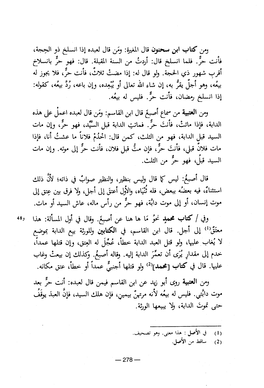 ومن كتاب ابن سحنون قال المغيرة: ومن قال إذا انسلخ ذو الحجة فأنت حر. فلما انسلخ قال: أردت من السنة المقبلة. وقال: فهو حر بانسلاخ أقرب شهور ذى الحجة. ولو قال له: إذا مضت ثلاث, فأنت حر, فلا يجوز له بيعه, وهو أجل يقر به, إن شاء الله تعالى أو يبعده, وإن باعه, رد بيعه, كقوله: إذا انسلخ رمضان, فأنت حر. فليس له بيعه. ومن العتبية من سماع أصبغ قالابن القاسم: ومن قال لعبده اعمل على هذه الدابة, فإذا ماتت, الدابة قبل السيد, فهو حر, وإن مات السيد قبل الدابة, فهو من الثلث, كمن قال: اخدم فلانا ما عشت أنا, فإذا مات فلان قبلي, فأنت حر, فإن مت قبل فلان, فأنت حر إلى موته. وإن ماات السيد قبل, فهو حر من الثلث. قال أصبغ: ليس كما قال وليس بنظير, والنظير صواب في ذاته؛ لان ذلك استثناء, فيه بعضه ببعض, فله ثنياه, والاول أعتق إلى أجل, ولا فرق بين عتق إلى موت إنسان, أو إلى موت دابة, فهو حر من رأس ماله, عاش السيدأو مات. وفى كتاب/ محمد نحو ماها هنا عن أصبغ. وقال في أول المسألة: هذا معتق (¬1) إلى أجل. قال ابن القاسم, في الكتابين وللورثة بيع الدابة بومضع لا يغاب عليها, ولو قتل العبد الدابة خطأ, عجل له العتق, وإن قتلها عمدا, خدم إلى مقدار يرى أن تعمر الدابة إليه. وقاله أصبغ. وكذلك إن بيعت وغاب عليها. قال في كتلاب (محمد) (¬2) ولو قتلها أجنبى عمدا أو خطأ, عتق مكانه. ومن العتبيةروى أبو زيد عن ابن القاسم فيمن قال لعبده: أنت حر بعد موت دابتى. فليس له بيعه لأنه مرتهن بيمين, فإن هلك السيد, فإن العبد يوقف حتى تموت الدابة, ولا يبيعها الورثة