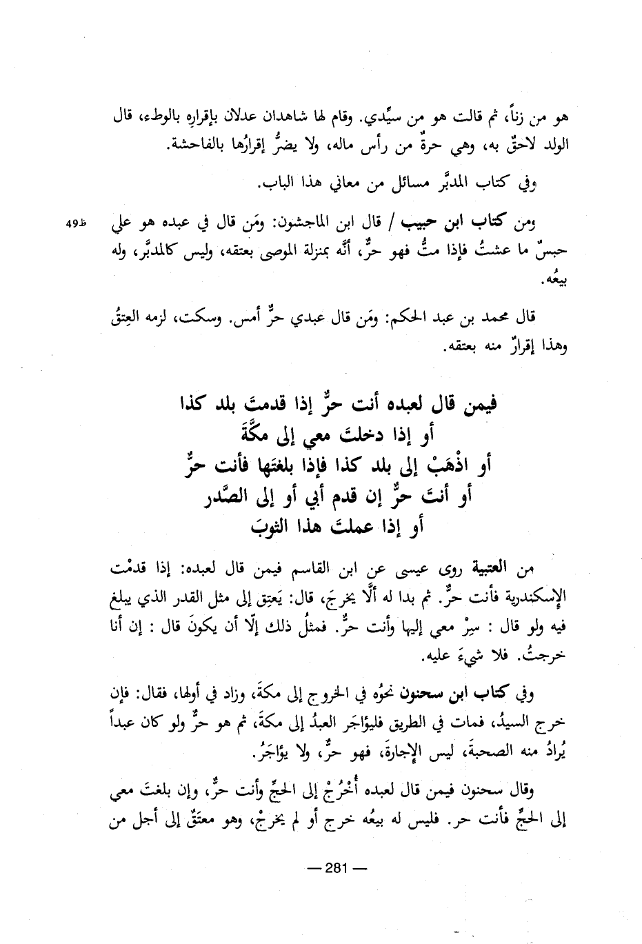 هو من زنا ثم قالت هو من سيدى. وقام لها شاهدان عدلان باقراه بالوطء, قال الولد لاحق به, وهى حرة من رأس ماله, ولا يضر إقرارها بالفاحشة. وفى كتاب المدبر من معانى هذا الباب. ومن كتاب ابن حبيب/ قال ابن الماجشون: ومن قال فى عبده هو على حبس ما عشت فّا مت فهو حر, أنه بمنزلة الموصى بعتقه, وليس كالمدبر, وله بيعه. قال محمد بن عبد الحكم: ومن قال عبدى حر أمس. وسكت, لزمه العتق وهذا إقرار منه بعتقه. فيمن قال لعبده أنت حر إذا قدمت بلد كذا أو دخلت معى إلى مكة أو ذهبت إلى بلد كذا فإذا بلغتها فأنت حر أو أنت حر إن قدم أبى أو إلى الصدر أو ّذا علمت هذا الثوب من العتبية روى عيسى عن ابن القاسم فيمن قال لعبده: إذا قدمت الاسكندرية فانت حر. ثم بدا ألا يخرج, قال: يعتق إلى مثل القدر الذى يبلغ فيه ولو قال: سر معى إليها وأنت حر. فمثل ذلك إلا يكون أن يكون قال: إن أنا خرجت. فلا شىء عليه. وفى كتاب ابن سحنون نحوه فى الخروج إلى مكة, وزاد في أولها فقال: فإن خرج السيد, فمات فى الطريق فليؤاجر العبد إلى مكة, ثم هو حر ولو كان عبدا يراد منه الصحبة, ليس إلاجازة , فهو حر,, ولا يؤاجر. وقال سحنون فيمن قال لعبده أخرج إلى الحج وأنت حر, وإن بلغت معى إلى الحج فأنت حر. فليس له بيعه خرج أو لم يخرج, وهو معتق إلى أجل من