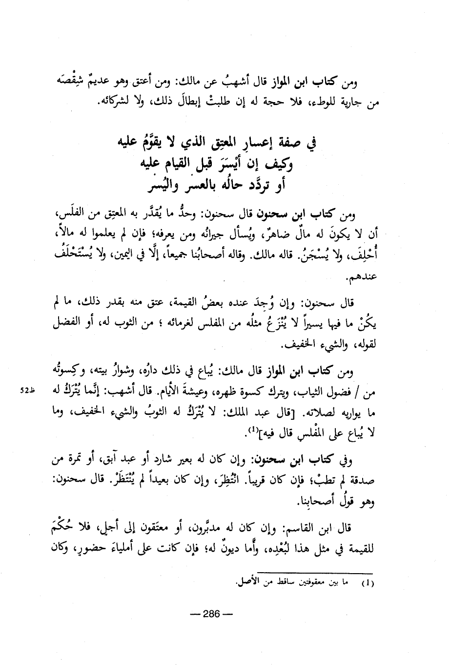 ومن كتاب ابن المواز قال أشهب عن مالك: ومن أعتق وهو عديم سقصه من جارية للوطء, فلا حجة له إن طلبت إبطال ذلك, ولا لشركائه. فى صفة إعسار المعتق الذى لا يقوم عليه وكيف إن أيسر قبل القيام عليه أو تردد حاله بالعسر واليسر ومن كتاب ابن سحنون قال سحنون: وحد ما يقدر به المعتق من الفلس, أن لا يكون له مال ضاهر, ويسأل جيرانه ومن يعرفه؛ فإن لم يعملوا له مالا, وأحلف, ولا يسجن. قاله مالك. وقاله أصحابنا جميعا, إلافى اليمين, ولا يستحلف عندهم. قال سحنون: وإن وجد عنده بعض القيمة, عتق منه بقدر ذلك, مالم يكن ما فيها يسيرا لا تنزع مثله من المفلس لغرمائه؛ من الثوب له, أو الفضل لقوله والشىء الخفيف. ومن كتاب ابن المواز قال مالك: يباع فى ذلك داره, وشوار بيته, وكسوته من/ فضول الثياب, ويترك كسوة ظهره, وعيشة الايام. قال أشهب: إنما يترك لهما يواريه لصلاته. (قال عبد الملك: لا يترك له الثواب والشىء الخفيف, وما لا يباع على المفلس قال فيه) (¬1). وفى كتاب ابن سحنون: وإن كان له بعير شارد أو عبد آبق, أو تمرة من صدقة لم تطلب؛ فإن كان قريبا. أنتظر, وإن كان بعيدا لم ينتظر. قال سحنون: وهو قول أصحابنا. قال ابن القاسم: وإن كان له مدبرون, أو معتقون إلى أجل, فلا حمكم للقيمة فى مثل هذا لعبده, وأما ديون له؛ فإن كانت على أملياء حضور, وكان