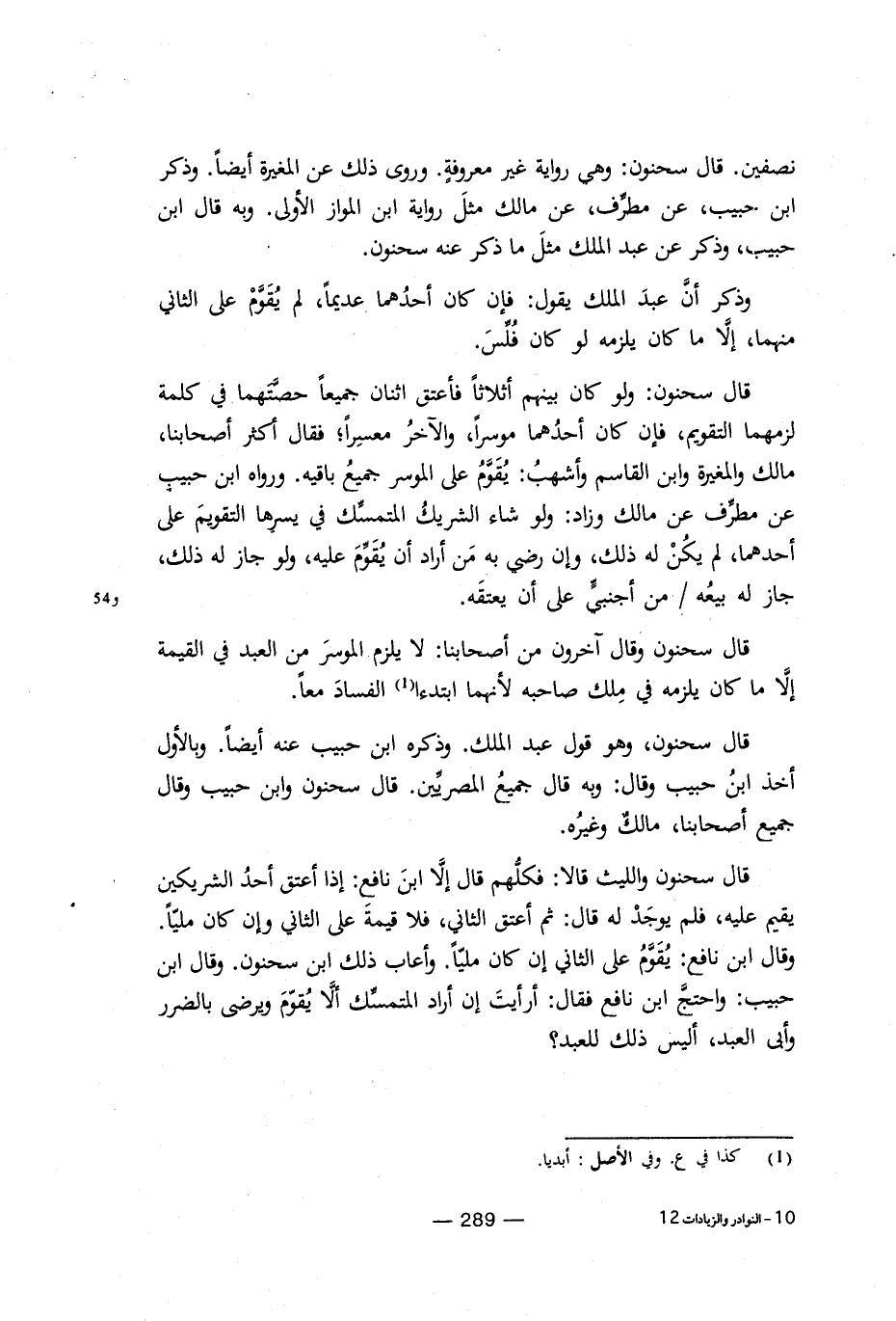 نصيف. قال سحنون: وهى روايه غير معروفة. وروى ذلك عن المغيرة أيضا. وذكر ابن حبيب, عن مطرف, عن مالك مثل رواية ابن المواز الأولى. وبه قال ابن حبيب, وذك عن عبد الملك مثل ما ذكر عنه سحنون. وذكرأن عبد الملك يقول: كان احدهماعديما, لم يقوم على الثانى منهما, غلا ماكان يلزمة لو كان فلس. قال سحنون: ولو كان بينهم أثلاثا فأعتق اثنان جميعا حصتها فى كلمة لزمها التقويم, فإن كان احدهما موسورا, والأخر معسرا؛ فقال أكثر أصحابنا, مالك والمغيرة وابن القاسم وأشهب: يقوم على الموسر جميع باقيه. ورواه ابن حبيب عن مطرف عن مالك وزاد: ولو شاء الشريك المتمسك فى يسرها التقويم على أحدهما, لم يكن له ذلك, وإن رضى به من أراد ان يقوم عليه ولو جاز له ذلك, جاز له بيعه/ من أجنبى على أن يعتقه. قال سحنون وقال آخرون من أصحابنا: لا يلزم الموسر من العبد فى القيمه إلا ما كان يلزمه فى ملك صاحبه لأنهما ابتدءا (¬1) الفساد معا. قال سحنون, وهو قول عبد الملك. وذكره ابن حبيب عنه أيضا. وبالاول أخذ ابن حبيب قال: وبه قال جميع المصريين. قال سحنون وابن حبيب وقال جميع أصحابنا, مالك وغيره. قال سحنون واليث قالا: فكلهم قال ابن نافع: إذا أعتق أحد الشريكين يقيم عليه, فلم يوجد لهقال: ثم أعتق الثانى, فلا قيمة على الثانىوإن كان مليا. وقال ابن نافع: يقوم على الثانى إن كان مليا. وأعاب ذلك ابن سحنون. وقال ابن حبيب: واحتج ابن نافع فقال: أرأيت عن اراد المتمسك ألا يقوم ويرضى بالضرر وأبى العبد , أليس ذلك للعبد؟