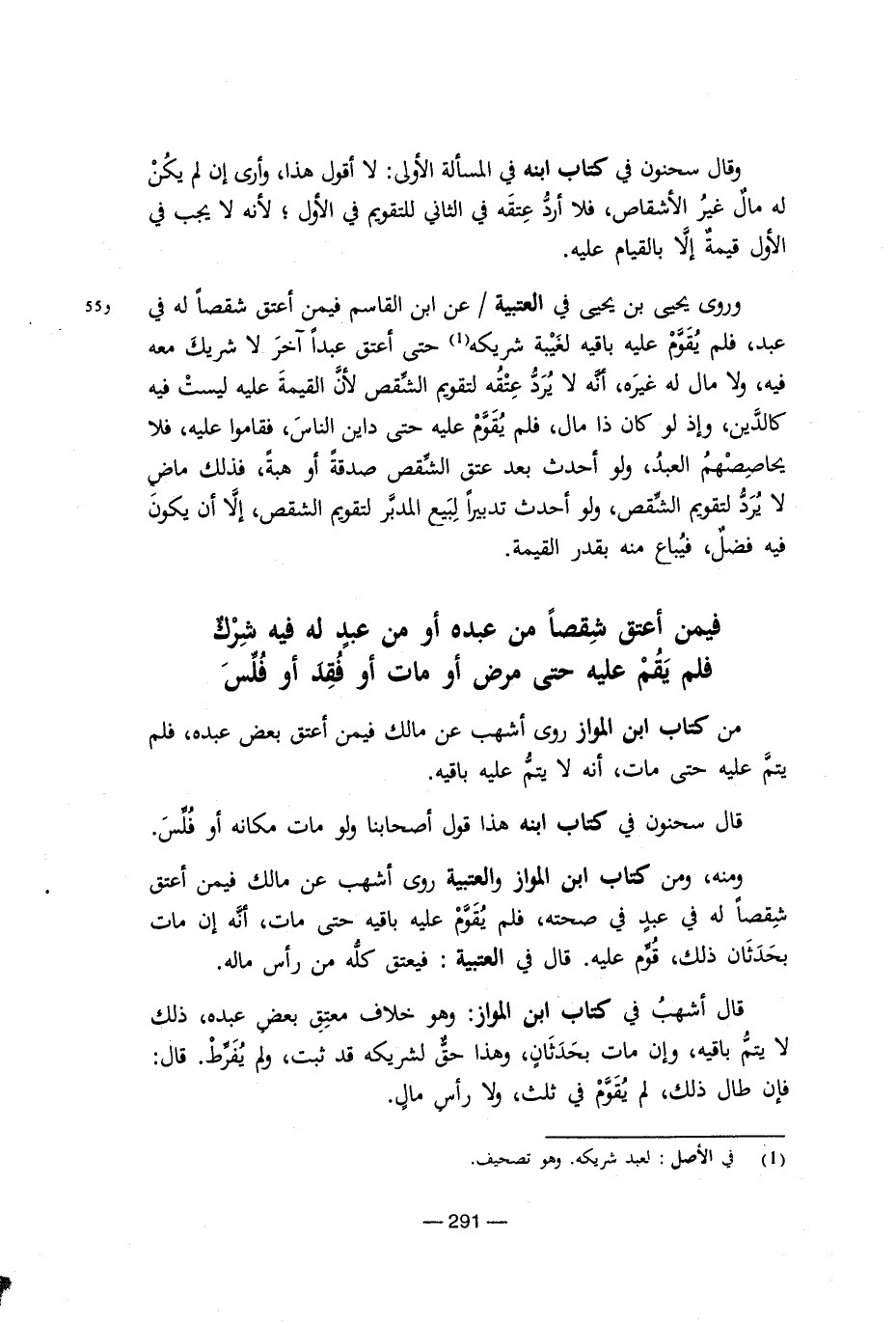 قال سحنون فى كتاب ابنه فى المسالة الاولى: لا أقول هذا, ورأى إن لم يكن له مال غير الاشقاص, فلا أرد عتقه فى الثانى للتقويم فى الأول؛ لأنه لا يجب فى الول قيمة إلا باقيام عليه. وروى يحيى بن يحيى فى العتبية/ عن ابن القاسم فيمن أعتق شقصا له فى عبد, فلم يقوم عليه باقيه لغيبة شريكه (¬1) حتى أعتق عبدا لا شريك مهه فيه, ولا مال له غيره, أنه لا يرد عتقه لتقوم الشقص لأن القيمه عليه ليست فيه كالدين, وإذا لو كان ذا مال, فلم يقوم عليه حتى داين الناس, فقاموا عليه, فلا يحاصصهم العبد, لو أحدث بعد عتق الشقص صدقة أو هبة, فذلك ماض لا يرد لتقويم الشقص, لو حدث تدبيرا لبيع المدبر لتقوم الشقص, إلا ان يكون فيه فضل, فيباع منه بقدر القيمة. فيمن أعتق شقصا من عبده أو من عبد له فيه شرك فلم يقم عليه حتى مرض أو مات أو فقد أو فلس من كتاب ابن المواز روى أشهب عن مالك فيمن أعتق بعض عبده, فلم يتم عليه حتى مات, أنه لا يتم عليه باقيه. قال سحنون فى كتاب ابنه هذا قول أصحابنا ولو مات مكانه أو فلس. ومنه, ومن كتاب ابن المواز والعتبية روى أشهب عن مالك فيمن أعتق شقصا له في عبد في صحته, فلم يقوم عليه باقية حتى مات, أنه إن مات بحدثان ذلك, قوم عليه. قال فى العتبية: فيعتق كله من رأس ماله. قال أشهب فى كتاب ابن المواز: وهو خلاف معتق بعض عبده, ذلك لا يتم باقيه, وإن مات بحدثان وهذا حق لشريكه قد ثبت, ولم يفرط. قال: فإن طال ذلك, لم يقوم فى ثلث, ولا رأس مال