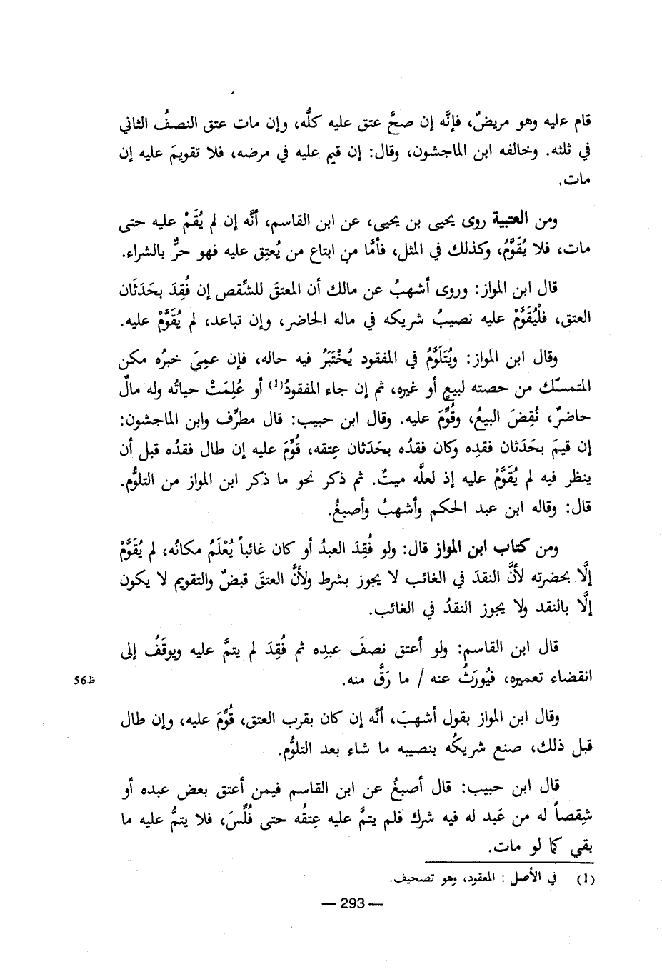 قام عليه وهو مريض, فإنه إن صح عتق عليه كله, وغن مات عتق النصف الثانى فى ثلثه. وخالفه ابن الماجشون, وقال: إن قيم عليه فى مرضه, فلا تقوم عليه إن مات. ومن العتبية روى يحيى, عن ابن القاسم, أنه إن لم يقم عليه حتى مات, فلا يقوم, وكذلك فى المثل, فأما من ابتاع من يعتق عليه فهو حر بالشراء. قال ابن المواز: وروى أشهب عن مالك أن المعتق للشقص إن فقد بحدثان العتق, فليقوم عليه نصيب شريكه فى ماله الحاضر, وإن تباعد, لم يقوم عليه. وقال ابن المواز: ويتلوم فى المفقود يختبر فيه حاله, فغن عمى خبره مكن المتمسك من حصته لبيع أو غيره, ثم إن جاء المفقود (¬1) أو علمت حياته وله مال حاضر, نقض البيع, وقوم عليه. وقال ابن حبيب: قال مطرف وابن الماجشون: إن قيم بحدثان فقده وكان بحدثان عتقه, قوم عليه إن طال فقده قبل أن ينظر فيه لم يقوم عليه إذا لعله ميت. ثم ذكر نحو ابن المواز من التلوم. قال: وقاله ابن عبد الحكم وأشهب وأصبغ. ومن كتاب ابن المواز: ولو فقد العبد أو كان غائبا يعلم مكانه, لم يقوم إلا بحضرته لأن النقد فى الغائب لا يجوز بشرط ولأن العتق قبض والتقويم لا يكون إلا بالنقد ولا يجوز النقد فى الغائب. قال ابن القاسم: ولو أعتق نصف عبده ثم فقد لم يتم عليه ويوقف إلى انقضاء تعميره, فيورث عنه/ ما أرق منه. وقال ابن المواز بقول أشهب, انه إن كان بقرب العتق, قوم عليه, وإن طاله قبل ذلك, صنع شريكه بنصيبه ما شاء بعد التلوم. قال ابن حبيب: قال أصبغ عن ابن القاسم فيمن أعتق بعض عبده أو شقصا له من عبد له فيه شرك فلم يتم عليه عتقه حتى فلس, فلا يتم عليه ما بقى كما لو مات