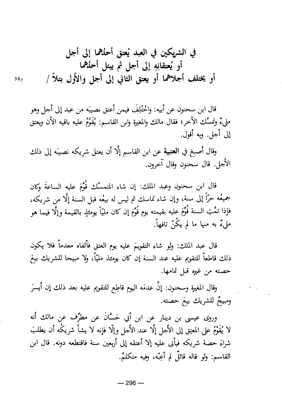 في الشريكين فى العبد أحدهما إلى أجل أو يعانقه إلى أجل ثم بيتل أحدهما أو يختلف أجلاهما أو يعتق الثانى على أجل والأول بتلا/ قال ابن سحنون عن أبيه: واختلف فيمن أعتق من نصيبه من عبد إلى أجل وهو ملىء وتمسك الآخر؛ فقال مالك والمغيرة وابن القاسم: يقوم عليه باقيه الآن ويعتق إلى أجل. وبه أقول. وقال أصبغ فى العتبية عن ابن القاسم إلا ان يعتق شريكه نصيبه إلى الأجل. قال سحنون وقال آخرون. قال ابن سحنون وعبد الملك: إن شاء المتمسك قوم عليه الساعة وكان جميعة إلى سنة, وإن شاء تماسك ثم ليس له بيعه قبل السنة إلا من شريكه, فإذا تمت السنة قوم عليه بقيمته يوم قوم إن كان مليا يومئذ بالقيمة وإلا فيما هوملىء به منها لم يكن تافها. قال عبد الملك: ولو شاء التقويم عليه يوم العتق فألفاه معدما فلا يكون ذلك قاطعا للتقويم عليه عند السنة إن كان يومئذ مليا, مبيحا للشريك بيع حصته من غيه قبل تمامها. وفى المغيرة وسحنون: إن عدمه اليوم قاطع للتقويم عليه بعد عن أيسر ومبيح للشريك بيع حصته. وروى عيسى بن دينار عن ابن أبى حسان عن مطرف عن مالك انه لا يقوم على المعتق إلى عند الأجل وإلا فإنه لا يشأ شريكه ان يطلب شراء حصته شريكه فيأبى عليه إلا أعتقه إلى أربعين سنة فاقطتطعه دونه. قال ابن القاسم: ولو قاله قائل لم اعبه, وفيه متكلم