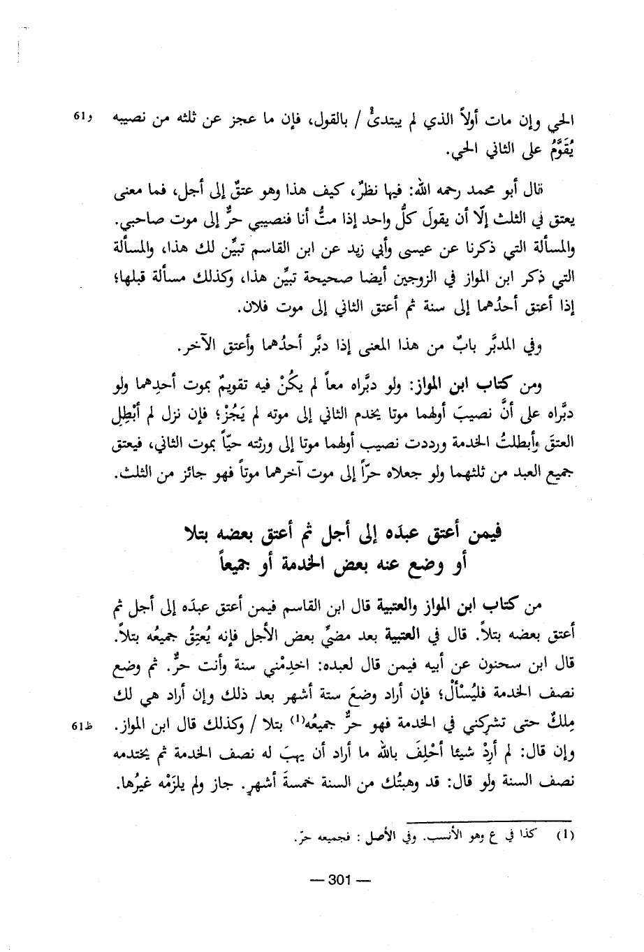 احى وغن مات أولا الذى لم يبتدى/ بالقول, فإن ما عجز عن ثلثه من نصيبه يقوم على الثانى الحى. قال أبو محمد رحمه الله: فيها نظر, كيف هذا وهو عتق على أجل, فما معنى يعتق فى الثلث إلا أن يقول كل واحد إذا مت أنا فنصيبى حر إلى موت صاحبى والمسألة التى ذكرنا عن عيسى وابى زيد عن ابن القاسم تبين لك هذا, والمسأله التى ذكر ابن المواز فى الزوجين أيضا صحيحة تبين هذا , وكذلك مسالة قبلها؛ إذا أعتق احدهما إلى سنة ثم اعتق الثانى إلى موت فلان. وفى المدبر باب من هذا المعنى إذا دبر أحدهما وأعتق الاخر. ومن كتاب ابن المواز: ولو دبراه معا لم يكن فيه تقويم بموت احدهما ولو دبراه على أن نصيب اولهما موتا يخدم الثانى إلى موته لم يجز؛ فإن نزل لم ابط العتق وأبطلت الخدمة ورددت نصيب اولهما موتا إلى ورثته حيا بموت الثانى, فيعتق جميع العبد من ثلثهما ولو جعلاه إلى موت آخرهما موتا فهو جائز من الثلث. فيمن اعتق عبده إلى أجل ثم اعتق بعضه بتلا او وضع عنه بعض الخدمه او جميعا من كتاب ابن المواز والعتبية قال ابن القاسم فيمن اعتق عبده على أجل ثم أعتق بعضه بتلا. وقال فى العتبية بعد مضى عض الجل فإنه يعتق جميعه بتلا. قال ابن سحنون عن ابيه فيمن قال لعبده: اخدمنى سنة وانت حر. ثم وضع نصف الخدمة فليسأل؛ فإن أراد وضع ستة أشهر بعد ذلك وإن أراد هى لك ملك حتى تشركنى فى الخدمة فهو حر جميعه (¬1) بتلا/ وكذلك قال ابن المواز. وإن قال: لم ارد شيئا احلف بالله ما أراد ان يهب له نصف الخدمة ثم يختدمه نصف السنة ولو قال: وهبتك من السنة خمسة اشهر. جاز ولم يلزمه غيرها