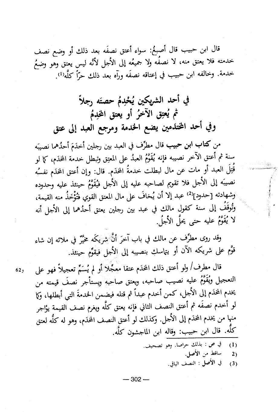 قال ابن حبيب قال أصبغ: سواء اعتق نصفه بعد ذلك أو وضع نصف خدنمته فلا يعتق منه, ولا نصفه ولا جميعه إلى الجل لنه ليس يعتق وهو وضع خدمة. وخالفه ابن حبيب فى إعتاقه نصفه ورآه بعد ذلك حرا كله (¬1) فى أحد الشريكين يخدم حصته رجلا ثم يعتق الاخر المخدم وفى احد المخدمين يضع الخدمة ومرجع العبد إلى عتق من كتاب ابن حبيب قال مطرف فى العبد بين رجلين أخدم احدهما نصيبه سنة ثم عتق الآخر نصيبه فإنه يقوم العبد عى المعتق وتبطل خدمة المخدم, كما لو قتل العبد او مات عن ماللبطلت خدمة المخدم. قال: وإن اعتق المخدم مفسه نصيبه إلى الأجل فلا تقويم لصاحبه عليه إلى الأجل فيقوم حينئذ عليه وحدودة وشهادته (حدود) (¬2) عبد إلا أن يخاف على مال المعتق القوى فتؤخذ منه القيمة, وتوقف إلى سنة كقول مالك فى عبد بين رجلين يعتق أحدهما إلى الأجل أنه لا يقوم عليه حتى يحل الأجل. وقد روى مطرف عن مالك فى باب آخر أن شريكه مخير فى ملائه عن شاء قوم على شريكه الان او يتماسك بنصيبه على الجل فيقوم حينئذ قال مطرف/ ولو اعتق ذلك المخدم عتقا معجلا او لم يسم تعجيلا فهو على التعجيل ويقوم عليه نصيب صاحبه, ويعتق صاحبة ويستأجر نصف قيمته من لو اخدم نصفه ثماعتق النصف الثانى فغنه يعتق كله ويغرم نصف القيمة يؤاجر منها من يخدم المخدم إلى الجل. وكذلك لو أعتق النصف المخدم, وهو له كله لعتق كله. قال ابن حبيب: وقاله ابن الماجشون كله