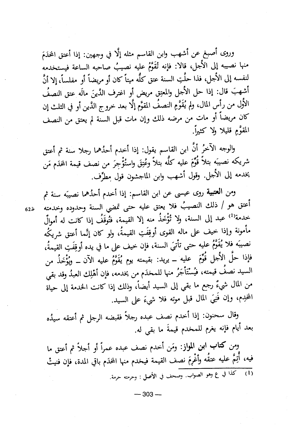 وروى أصبغ عن أشهب وابن القاسم مثله إلا فى وجهين: إذا أعتق المخدم منها نصيبه إلى الأجل, قالا: فإنه تقوم عليه نصيب صاحبه الساعة فيستخدمه لنفسه على الأجل, فذا حلت السنة عتق كله ميتا كان او مريضا او مفلسا, إلا ان أشهب قال: إذا حل الأجل والمعتق مريض أو اغترف الدين ماله عتق النصف الأول من رأس المال, ولم يقوم النصف المقوم إلا بعد خروج الدين او فى الثلث أن كان مريضا أو مات من مرضة ذلك وإن مات قبل السنة لم يعتق من النصف المقوم ولا كثيرا. والوجه الآخر ان ابن القاسم يقول: إذا أخدم احدهما رجلا سنة ثم اعتق شريكه نصيبه بتلا قوم عليه كله بتلا وعتق واستوجر من نصف قيمة المخدم من يخدمه على الأجل. وقول اشهب وابن الماجشون قول مطرف. ومن العتبية روى عيسى عن ابن القاسم: إذا أخدم احدهما نصيبه سنة ثم خدمة (¬1) عبد على السنة, ولا تؤخذ منه إلا القيمة, فتوقف إذا كانت له اموال مأمونة وإذا خيف على ماله القوى اوقفت القيمة, ولو كان إنما أعتق شريكه نصيبه فلا يقوم عليه حتى تأتى السنة, فغن خيف على ما يده اوقفت القيمة, فإذا حل الأجل قوم عليه - يريد: بقيمته يوم يقوم عليه الآن - ويؤخذ من السيد نصف قيمته, فيستأجر منها للمخدم من يخدمه, فإن أهللك العبد وقد بقى من المال شىء رجع ما بقى إلى السيد أيضا, وذلك إذا كانت الخدمة على حياة المخدم, وإن فنى المال قبل موته فلا شىء على السيد. وقال سحنون: إذا اخدم نصف عبده رجلا فقبضه الرجل ثم اعتقه سيده بعد أيام فإنه يغرم للمخدم قيمة ما بقى له. ومن كتاب ابن المواز: ومن أخدم نصف عبده عمرا اةو اجلا ثم أعتق ما فيه, اتم عليه عتقه وأغرم نصف القيمة فيخدم منها المخدم ياقى المدة, فغن فنيت