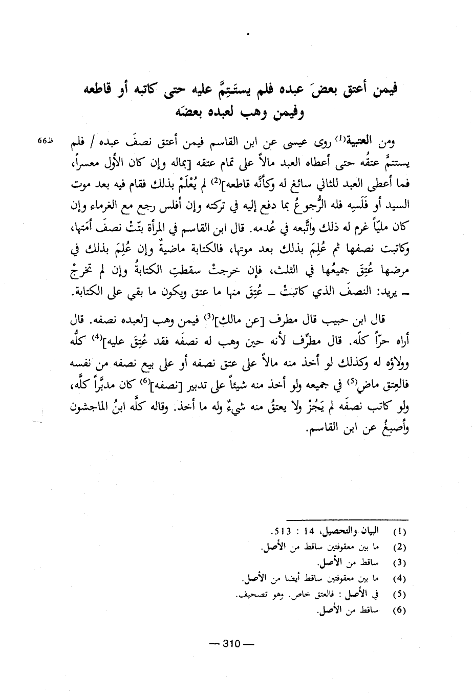 فيمن أعتق بعض عبده فلم يستتم عليه حتى كاتبه او قاطعه وفيمن وهب لعبده بعضه ومن العتبية (¬1) روى عيسى عن ابن القاسم فيمن أعتق نصف عبده/ فلم يستتم عتقهحتى أعطاه العبد مالا على تمام عتقه (بماله وإن كان الأول معسرا, فما أعطى العبد للثانى سائغ له وكأنه قاطعه) (¬2) لم يعلم بذلك فقام فيه بعد موت السيد او فلسه فله الرجوع بما دفع إليه فى تركه وإن أفلس رجع مع الغرماء وإن كان مليا له ذلك واتبعه فى عدمه. قال ابن القاسم فى المرأة بتت نصف امتها, وكاتبت نصفها ثم علم بذلك بعد موتها, فالكتابة ماضيه وإن علم بذلك فى مرضها عتق جميعها فى الثلث, فغن خرجت سقطت الكتابة وإن لم تخرج - يريد: النصف الذى كاتبت - عتق منها ويكون ما بقى على الكتابة. قال ابن حبيب قال مطرف (عن مالك) (¬3) فيمن وهب (لعبده نصفه. قال أراه حراه كله. قال مطرف لأنه حين وهب له نصففه فقد عتق عليه) (¬4) كله وولاؤه له وكذلك لو أخذ منه مالا على عتق نصفه او على بيع نصفه من نفسه فالعتق ماض (¬5) في جميعه ولو اخذ منه شيئا على تدبير (نصفه) (¬6) كان مدبرا كله, ولو كاتب نصفه لم يجز ولا يعتق منه شىء وله ما أخذ. وقاله كله ابن الماجشون واصبغ عن ابن القاسم