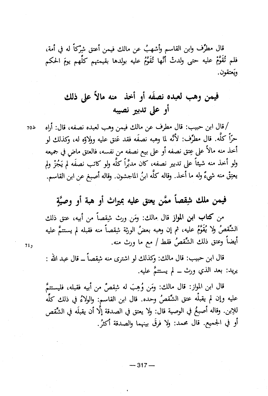 قال مطرف وابن القاسم وأشهب عن مالك فيمن أعتق شركا له فى أمة, فلم تقوم عليه حتى ولدت انها تقوم عليه بولدها بقيمتهم كلهم يوم الحكم ويعتقون. فيمن وهب لعبده نصفه أو اخذ منه مالا على ذلكأو على تدبير/ قال ابن حبيب: قال مطرف عن مالك فيمن وهب لعبده نصفه, قال: أراه حا كله. قال مطرف: لأنه لما وهبه نصفه فقد عليه وولاؤه له, وكذلك لو أخذ منه مالا على عتق نصفه أو على بيع نصفه من نفسه, فالعتق ماض فى جميعه ولو أخذ منه شيئا على تدبير نصفه, كان مدبرا كله ولو كاتب نصفه لميجز ولم يعتق منه شىء وله ما أخذ. وقاله كله ابن الماجشون. وقاله أصبغ عن ابن القاسم. فيمن ملك شقصا ممن عليه بميراث أو هبة أو وصيه من كتاب ابن المواز قال مالك: ومن ورث شقصا من أبيه, عتق ذلك الشقص ولا يقوم عليه, ثم إن وهبه بعض الورثة شقصا منه فقبله لم يستتم عليه ايضا وعتق ذلك الشقص فقط/ مع ورث منه. قال ابن حبيب: قال مالك: وكذلك لو اشترى منه شقصا - قال عبد الله: يريد: بعد الذى ورث -لم يستتم عليه. قال ابن المواز: قال مالك: ومن وهب له شقص من أبيه فقبله, فليستتم عليع وإن لم يقبله عتق الشقص وحده. قال ابن القاسم: والولاء فى ذلك كله للابن. وقاله أصبغ فى الوصية قال: ولا يعتق إلا ان يقبله فى الشقص او فى الجميع. قال محمد: ولا فرق بينهما والصدقة أكثر