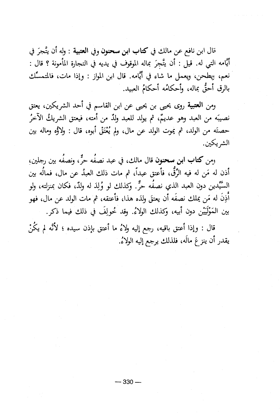 قال نافع عن مالك فى كتاب ابن سحنون وفى العتبية: وله أن يتجر في أيامه التى له. قيل: أن يتجر بماله الموقوف فى يديه فى التجارة المأمونة؟ قال: نعم, ويطحن, ويعمل ما شاء فى أيامه. قال ابن المواز: وإذا مات, فالمتمسك بالرق أحق بماله وأحكامه أحكام العبيد. ومن العتبية روى يحسيى بن يحيى عن ابن القاسم فى أحد الشريكين, يعتق نصيبه من العبد وهو عديم, ثم يولد للعبد ولد من أمته, فيعتق الشريك الآخر حصته من الولد, ثم يموت الولد عن مال, ولم يعتق أبوه, قال: ولاؤه وماله بين الشريكين. ومن كتاب ابن سحنون قال مالك, فى نصفه حر, ونصفه بين رجلين؛ أذن له من له فيه الرق, فأعتق عبدا, ثم مات ذلك العبد عن مال, فماله بين السيدين دون العبد الذى نصفه حر. وكذلك لو ولد, فكان بمنزلته, ولو أذن له من يملك نصفه أن يعتق ولده هذا, فأعتقه, ثم مات الولد عن مال, فهو بين الموليين دون أبيه, وكذلك الولاء. وقد خولففى ذلك فيما ذكر. قال: وإذا اعتق باقيه, رجع إليه ولاء ما أعتق بإذن سيده؛ لأنه لم يكتن يقدر أن ينزع ماله, فلذلك يرجع إليه الولاء