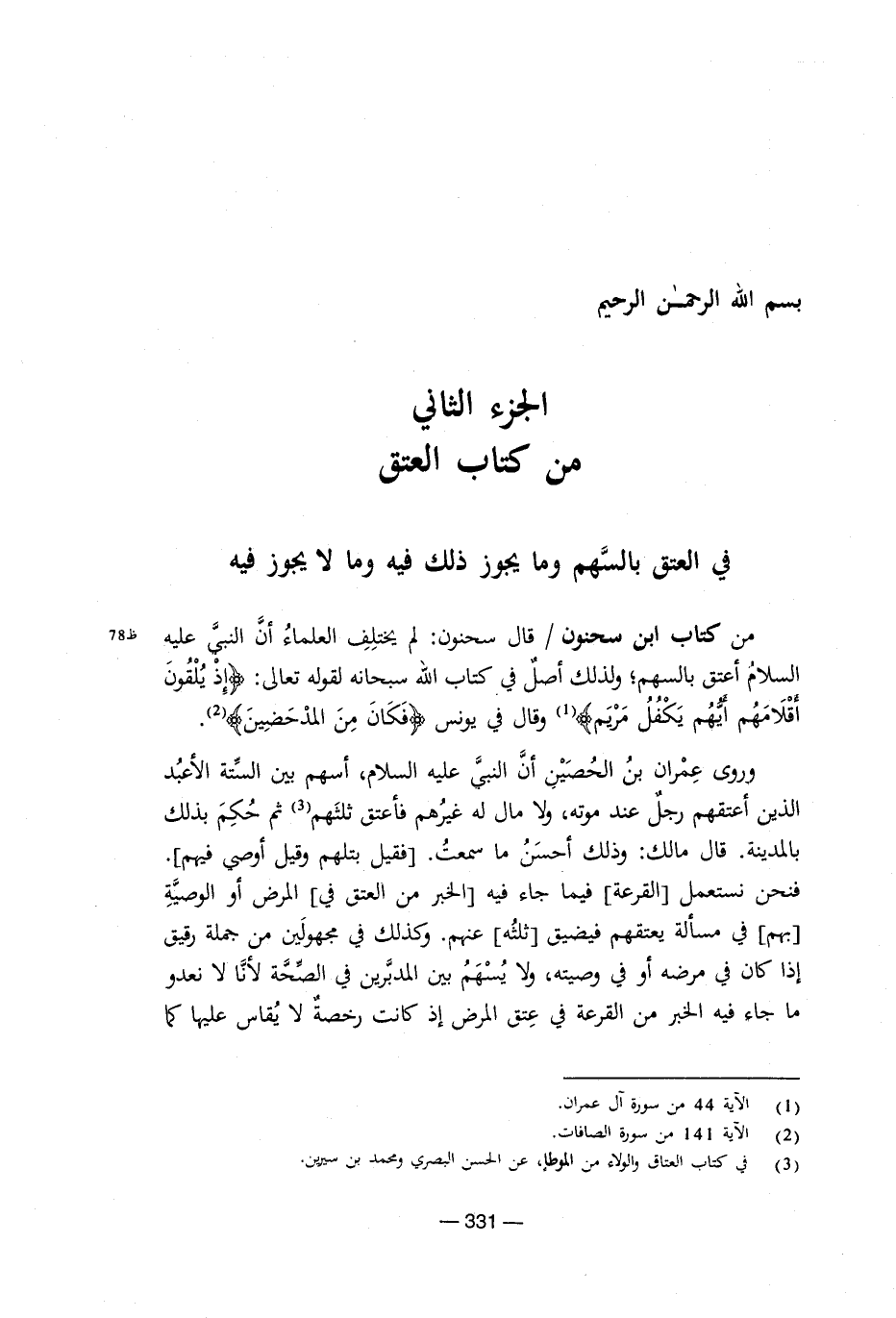 الجزء الثانى من كتاب العتق فى العتق باسهم وما يجوز ذلك فيه وما يجوز فيهمن كتاب ابن سحنون: لم يختلف العلماء أن النبى عليه السلام أعتق بالسهم؛ ولذلك أصل فى كتاب الله سبحانه لقوله تعالى: (إذ يلقون أقلامهم أيهم يكفل مريم (¬1) وقال فى يونس (فكان من المدحضين (¬2) وروى عمران بن الحصين أن النبى علية السلام, أسهم بين السته الأعبد الذين أعتقهم رجل عند موته, ولا مال له غيرهم فأعتق ثلثهم (¬3) ثم حكم بذلك بالمدينة. قال مالك: وذلك أحسن ما سمعت. (فقيل بتلهم وقيل فيهم). فنحن نستعمل (القرعة) فيما جاء فيه (الخبر من العتق من العتق في) المرض او الوصيه (بهم) في مسألة يعتقهم بضيق (ثلثه) عنهم. وكذلك فى المجهولين من جمله رقيق إذا كان فى مرضه أو وصيته, ولا يسهم بين المدبرين فى الصحة لأنا لا نعدو ما جاء فيه الخبر من القرعة فى عتق المرض إذ كانت رخصة لا يقاس عليها كما