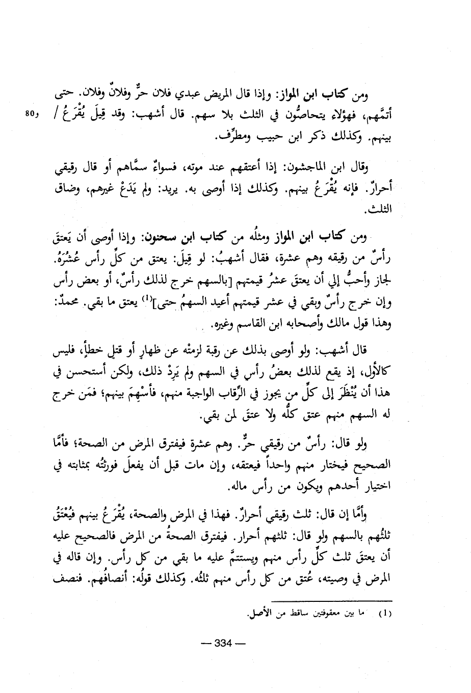 ومن كتاب ابن المواز: وإذا قال المريض عبدى حر وفلان وفلان. حتى اتمهم, وفهؤلاء يتحاصون فى الثلث بلا سهم. قال أشهب: وقد قيل يقرع/ بينهم. وكذلك ذكر ابن حبيب ومطرف. قال ابن الماجشون: وإذا اعتقهم عند موته, فسواء سماهم او قال رقيقى احرار. فإنه يقربع بينهم. وكذلك إذاأوصى به. يريد: ولم يدع غيرهم, وضاق الثلث. ومن كتاب ابن المواز ومثله من كتاب ابن سحنون: وإذا أوصى أن يعتق رأس من رقيقه وهم عشرة, فقال اشهب: لو قيل: يعتق من كل رأس عشرة لجاز وأحب إلى ان يعتق عشر قيمتهم (بالسهم خرج لذلك رأس, أو بعض رأس وغن خرج رأس وبقى فى عشرة قيمتهم أعيد السهم حتى) (¬1) يعتق مابقى. محمد: وهذا قول مالك وأصحابه ابن القاسم وغيره. قال أشهب: ولو اوصى بذلك عن رقبةلزمته عن ظهار او قتل خطأ, فليس كالاول, إذ يقع لذلك بعض رأس فى السهم ولم يرد ذلك, ولكن استحسن فى هذا أن ينظر إلى كل من يجوز فى الرقاب الواجبة منهم, فأسهم بينهم؛ فمن خرج له السهم منهم, فأسهم بينهم؛ فمن خرج له السهم منهم عتق كله ولا عتق لمن بقى. ولو قال: رأس من رقيقى حر. وهم عشرة فيفترق المرض من الصحة, فأما الصحيح فيختار منهم واحدا فيعتقه, وإن مات قبل أن يفعل فورثته بمثابة فى اختيار أحدهم ويكون من رأس ماله. وإما إن قال: ثلث رقيقى أحرار. فهذا فى المرض والصحة, يقرع بينهم فيعتق ثلثهم ولو قال: ثلثهم احرار. فيقترق الصحة من المرض فالصحيح عليه أن يعتق ثلث كل رأس منهم ويستتم عليه ما بقى من كل رأس. وإن قاله فى المرض في وصيته, عتق من كل رأس منهم ثلثه. وكذلك قوله: أنصافهم. فنصف
