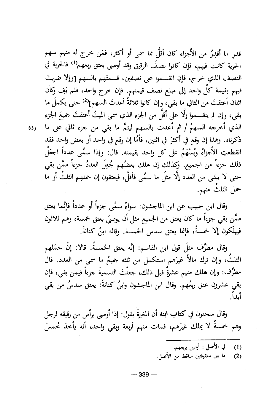 قدر ما أقدر من الاجزاء كان أقل مما سمى او أكثر, فمن خرج له منهم سهم الحرية كانت فيهم, فإن كانوا نصف الرقيق وقد أوصى بعتق ربعهم (¬1) فالحرية فى النصف الذى خرج, فغن انقسموا على نصفين, فإن خرج واحد, فلم يف وكان اثنان أعتقت من الثانى ما بقى, وإن كانوا ثلاثة اعدت السهم (¬2) حتى يكمل ما بقى, وإن لم ينقسموا إلا على أقل من الجزء الذى سمى الميت اعتقت جميع الجزء الذى أخرجه السهم/ ثم اعددت بالسهم ليتم ما بقى من جزء ثانى على ما ذكرناه. وهذا عن وقع فى اكثر فى اثنين, فأما إن وقع فى واحد او بعض واحد فقد انقطعت الاجزاء ويسهم على كل واحد بقيمته. قال: وإذا سمى عددا اجعل ذلك جزءا من الجميع. وكذلك إن هللك بعضهم جعل العدد جزءا ممن بقى حتى لا يبقى من العدد إلا مثل ما سمى فأقل, فيعتقون عن حملهم الثلث أو ما حمل الثلث منهم. وقال ابن حبيب عن ابن الماجشون: سواء سمى جزءا أو عددا فإنما يعتق ممن بقى جزءا ما كان يعتق من الجميع مثل ان يوصى بعتق خمسة, وهم ثلاثون فيهلكون إلا خمسة, فإنما يعتق سدس الخمسة. وقاله ابن كنانة. وقال مطرف مثل قول ابن القاسم: إنه يعتق الخمسة. قالا: إن حملهم الثلث, وإن ترك مالا غيرهم استكمل من ثلثه جميع ما سمى من العدد. قال مطرف: وإن هللك منهم عشرة قبل ذلك, جعلت التسمية جزءا فيمن بقى, فإن بقى عشرون عتق ربعهم. وقال ابن الماجشون وابن كنانة: يعتق سدس من بقى أبدا. وقال سحنون فى كتاب ابنه ان المغيرة يقول: إذا أوصى برأس من رقيقةلرجل وهم خمسة لا يملك غيرهم, فمات منهم أربعة وبقى واحدا, وأنه يأخذ خمس