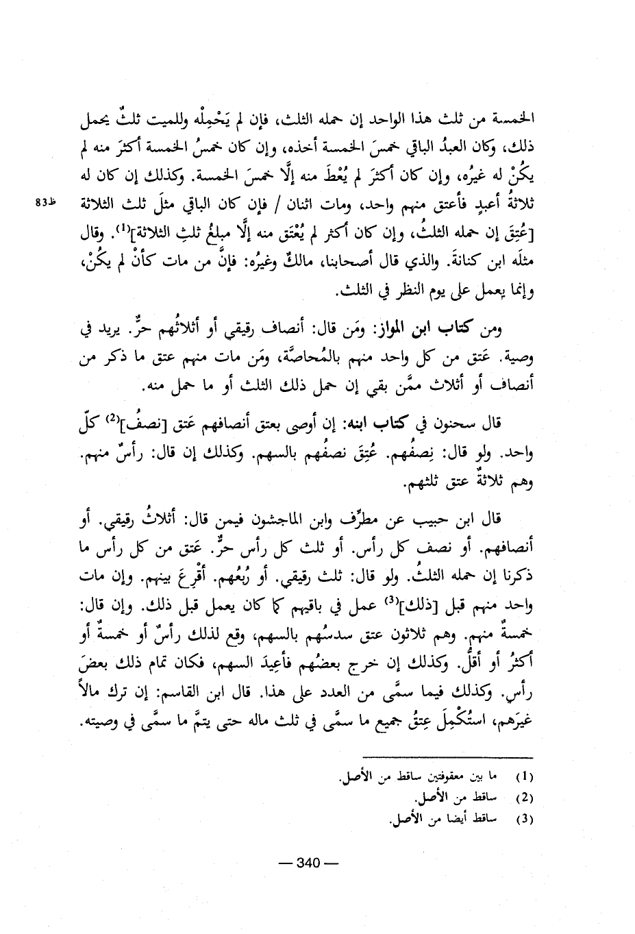 الخمسة من ثلث هذا الواحد إن حمله الثلث, فإن لم يحمله وللميت ثلث يحمل ذللك, وكان العبد الباقى خمس الخمسة أخذه, وإن كان خمس الخمسة أكثر منه لم يكن له غيره, وإن كان أكثر لم يعط منه إلا خمس الخمسة. وكذلك إن كان له ثلاثة أعبد فأعتق منهم واحد, ومات اثنان/ فإن كان الباقى كثل ثلث الثلاثة (عتق إن الثلث, وإن كان أكثر لم يعتق منه إلا مبلغ ثلث الثلاثة) (¬1). قال مثله ابن كنانة. والذى قال أصحابنا, مالك وغيره: فإن من مات كأن لم يكن, وإنما يعمل على يوم النظر فى الثلث. ومن كتاب ابن المواز: ومن قال: أنصاف رقيقى او أثلاثهم حر. يريد فى وصية. عتق من كل واحد منهم بالمحاصة, ومن مات منهم عتق ما ذكر من أنصاف او أثلاث ممن إن حمل ذلك الثلث أو ما حمل منه. قال سحنون فى كتاب ابنه: إن أوصى بعتق انصافهم عتق (نصف) (¬2) كل واحد. ولو قال: نصفهم. عتق نصفهم بالسهم. وكذلك عن قال: رأس منهم وهم ثلاثة عتق ثلثهم. قال ابن حبيب عن مطرف وابن الماجشون فيمن قال: أثلا رقيقى. أو انصافهم. او نصف كل رأس. او ثلث كل رأس حر. عتق من كل رأس ما ذكرنا إن حمله الثلث. ولو قال: رقيقى. أو ربعهم. أقرع بينهم. وإن مات واحد منهم قبل (ذلك) (¬3) عمل فى باقيهم كما كان يعمل قبل ذلك. وإن قال: خمسة منهم. وهم ثلاثون عتق سدسهم بالسهم, وقع لذلك رأس أو خمسة أو اكثر أو أقل. وكذلك إن خرج بعضهم فأعيد السهم, فكان تمام ذلك بعض رأس. وكذذلك فيما سمى من العدد على هذا. قال ابن القاسم: إن ترك مالا غيرهم, استكمل عتق جميع ما سمى فى ثلث ماله حتى يتم ما سمى فى وصيته