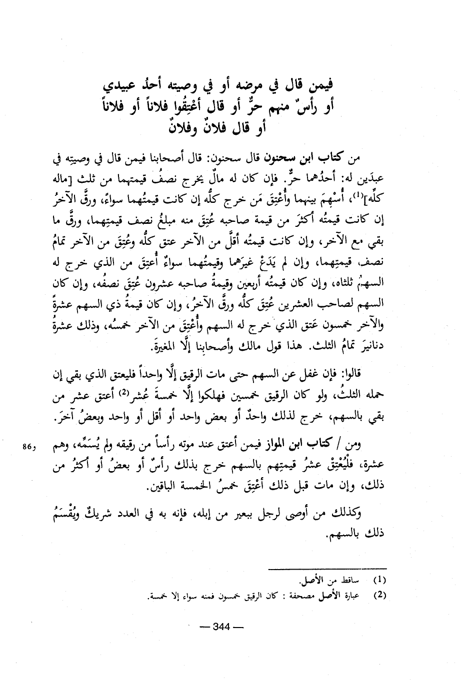 أو قال فلان وفلان من كتاب ابن سحنون قال سحنون: قال اصحابنا فيمن قال فى وصيته فى عبدين له: أحدهما حر. فإن كادن له مال يخرج نصف قيمتها من ثلث (ماله كله) (¬1) , أسهم بينهما وأعتق من خرج كله إن كانت قيمتهما سواء, ورق الآخر إن كانت قيمته اكثر من قيمة صاحبه عتق منه مبلغ نصف قيمتهما, ورق ما بقى مع الآخر, وإن كانت قيمته أقل من الآخر عتق كله من الآخر تمام نصف مع الاخر, وإن كانت قيمته أقل من الآخر عتق كله وعتق من الآخر تمام نصف قيمتهما, وإن لم يدع غيرهما وقيمتهما سواء أعتق من الذى خرج له السهم ثلثاه, وإن كادن قيمته أربعين وقيمة صاحبه عشرون عتق نصفه, وإن كان السهم لصاحب العشرين عتق كله ورق الآخر, وإن كان قيمة ذى السهم وذلك عشرة دنانير تمام الثلث. هذا قول مالك وأصحابنا إلا المغيرة. قالوا: فإن غفل عن السهم حتى مات الرقيق إلا واحدا فليعتق الذى بقى حمله الثلث, ولو كان الرقيق خمسين فهلكوا إلا خمسة عشر (¬2) أعتق عشر من بقى بالسهم, خرج لذلك واحد او بعض واحد او اقل او واحد وبعض وآخر ومن/ كتاب ابن المواز فيمن أعتق عند موته رأسا من رقيقه ولم يسمه, وهم عشرة, فليعتق عشر قيمتهم بالسهم خرج بذلك رأس أو بعض اكثر من ذلك, وإن مات قبل ذلك أعتق خمس الخمسة الباقين. وكذلك من اوصى لرجل ببعير من أبله, فإنه به فى العدد شريك ويقسم ذلك بالسهم