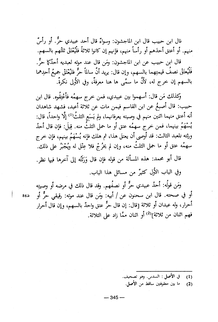 قال حبيب قال ابن الماجشون: وسواء قال احد عبيدى حر. أو رأس منهم. او عتق أحدهم او رأسا منهم, فإنهم إن كانوا ثلاثة فليعتق ثلثهم بالسهم. قال حبيب عن ابن الماجشون: ومن قال عند موته لعبيديه أحدكما حر. فليعتق نصف قيمتهما بالسهم, وإن قال: يريد ان سالما حر فليعتق جميع احدهما بالسهم إن خرج له, لأن ما سمى ها هنا معرفة, وفى الاولى نكرة. وكذلك من قال: أسهموا بين عبيدى, فمن خرج سهمه فاعتقوه. قال ابن حبيب: قال أصبغ عن ابن القاسم فيمن مات عن ثلاثة اعبد, فشهد شاهدان انه أعتق منهما اثنين منهم فى وصيته يعرفانهما, ولم يسع الثلث (¬1) إلا واحدا, قال: يسهم بينهما, فمن خرج سهمه عتق أو ما حمل الثلث منه. قيل: فإن قال احد ورثته للعبد الثالث: قد أوصى ان يعتق هذا, ثم هلك فإنه يسهم بينهم, فغن خرج سهمه عتق او ما حمل الثلث منه, وإن لم يخرج فلا عتق له ويجبر على ذلك. قال أبو محمد: هذة المسأله من قوله فغن قال ورثته على آخرها فيها نظر. وفى الباب الاول كثير من مسائل هذا الباب. ومن قوله: أحد عبيدى حر أو نصفهم. وقد قال ذلك فى مرضه او وصيته أو فى صحتة. قال ابن سحنون عن/ ابيه: ومن قال عند موته: رقيقى حر او أحرار, وله عبدان او ثلاثة (قال حر عتق واحد بالسهم, وإن قال احرار فهم اثنان من ثلاثة) (¬2) او اثنان مما زاد على الثلاثة