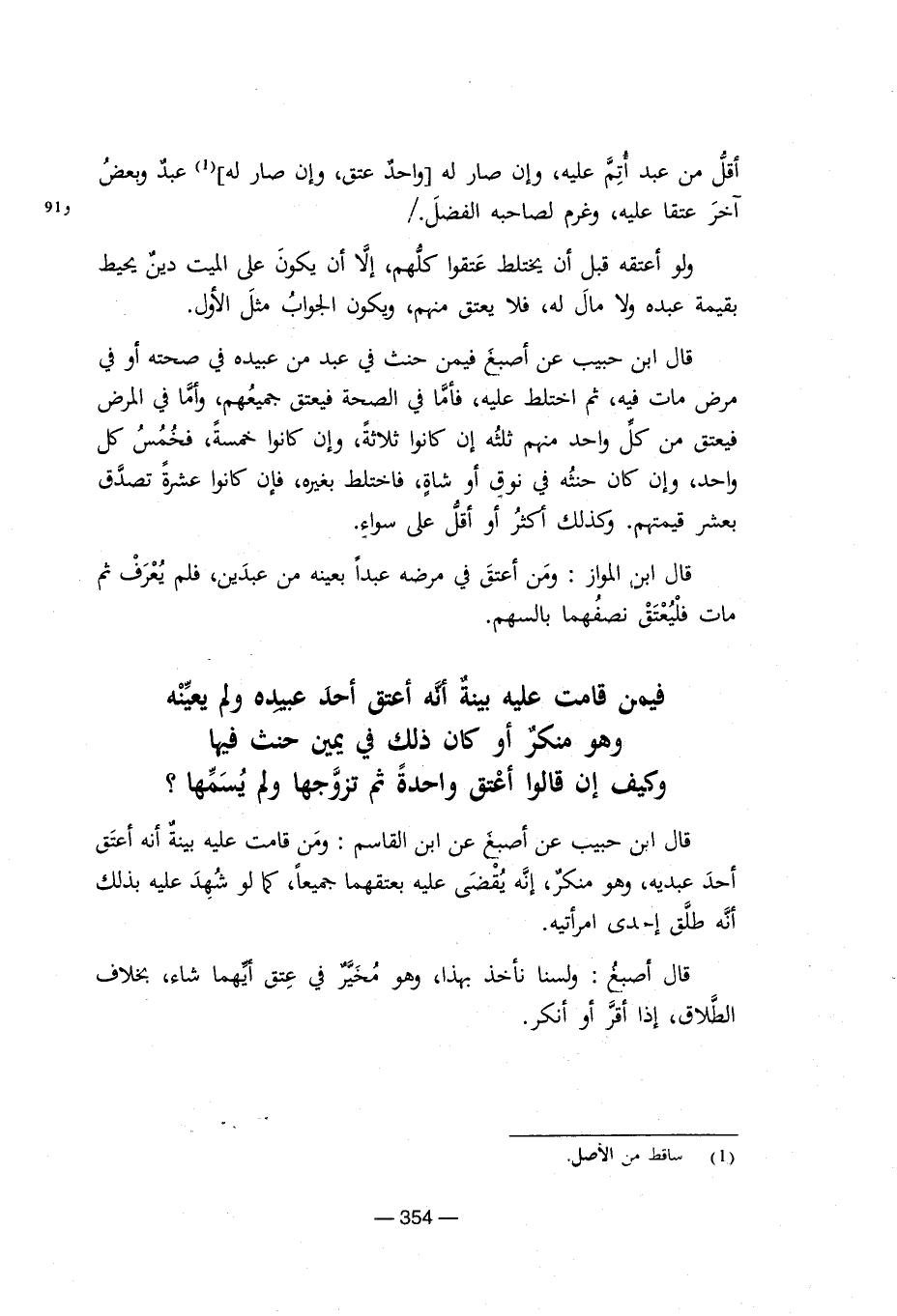 أقل من عبد ااتم عليه, وإن صار له (واحد عتق, وإن صار له) (¬1) عبد وبعض ىخر عتقا عليه, وغرم لصاحبه الفضل./ ولو أعتقه أن يختلط عتقوا كلهم, إلا أن يكون على الميت دين بحيط بقيمة عبده ولا مال له, فلا يعتق منهم, ويكون الجواب مثل الأول. قال ابن حبيب عن أصبغ فيمن حنث فى عبد من عبيده فى صحته او فى مرض مات فيه, ثم اختلط عليه, فأما فى الصحة فيعتق جميعهم, واما فى المرض فيعتق من كل واحد منهم ثلثه عن كانوا ثلاثة أن كانوا ثلاثة, وإن كانوا خمسة, فخمس كل واحد, وإن كان حنثه فى نوق أو شاة, فاختلط بغيره, فإن كانوا عشرة تصدق بعشرة قيمتهم. وكذلك اكثر أو أقل على سواء. قال ابن المواز: ومن أعتق فى مرضه عبدا بعينه من عبدين, فلم يعرف مات فليعتق نصفهما بالسهم. فيمن قامت عليه بينة أنه اعتق أحد عبيده ولم يعينه وهو منكر او كان ذلك فى يمين حنث فيها وكيف إن قالوا أعتق واحدة ثم تزوجها ولم يسمها؟ قل ابن حبيب عن أصبغ عن ابن القاسم: ومن قامت عليه بينة انه أعتق أحد عبديه, وهو منكر, إنه يقضى عليه بعتقهما جميعا, كما لو شهد بذلك انه طلق إحدى امرأتيه. قال: ولسنا نأخذ بهذا, وهو مخير فى عتق أيهما شاء, بخلاف الطلاق, إذا اقر أو أنكر