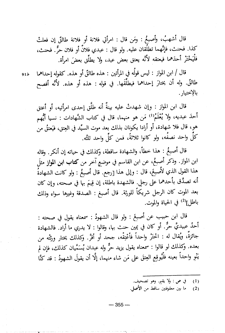 قال أشهب, وأصبغ: ومن قال: امرأتى فلانة او فلانة طالق عن فعلت كذا. فحنث, لإنهما تطلقان عليه. ولو قال: عبدى فلان أو فلان حر. فحنث فليختر احدهما فيعتقه لانه يعتق بعض عبد, ولا يطلق بعض امرأة. قال/ ابن المةواز: ليس قوله فى المرأتين: هذه طالق او هذه. كقوله إحداهما طالق. وله أن يختار إحداهما فيطلقها. فى قوله: هذه أو هذه. لأنه أفصح بالاختيار. قال ابن المواز: وإن شهدت عليه بينة انه طلق إحدى امراتيه, او أعتق أحد عبديه, ولا يعلم (¬1) من هو منهما, قال فى كتاب الشهادات: نسيا أيهم هو, قال فلا شهادة, او أراد يكونان بذلك لعد موت السيد فى العتق, من كل واحد نصفه, ولو كانوا ثلاثة, فمن كل واحد ثلثه. قد أصبغ: هذا خطأ, والشهادة ساقطة, وكذلك فى حياته إن أنكر. وقاله ابن المواز. وذكر أصبغ, عن ابن القاسم فى موضع ىخر من كتاب ابن المواز مثل هذا القول الذى لأصبغ, قال: وإلى هذا (رجع. قال أصبغ: ولو كانت الشهادة أنه تصدق بأحدما على رجل. فالشهدة باطلة, وإن قيم بها فى صحته, وإلى كان بعد الموت كان الرجل شريكا للورثة. قال أصبغ: الصدقة وغيرها سواء وذلك باطل) (¬2) فى الحياة والموت. قال ابن حبيب عن أصبغ: ولو قال الشهود: سمعناه يقول فى صحته: أحد عبيدى حر. او كان فى يمين حنث بها, وقالوا: لا يدرى ما اراد. فالشهادة جائزة, ويقال له: اختر واحدةفاعتقه, جحد او أقر. وكذلك يختار ورثته من بعده. وكذلك لو قالوا: سمعناه يقول يزيد حر وله عبدان يسميان كذلك, فإن لم ينو واحدة بعينه فليوقع العتق على منم شاء متنهما, غلا ان يقول الشهود: قد كنا