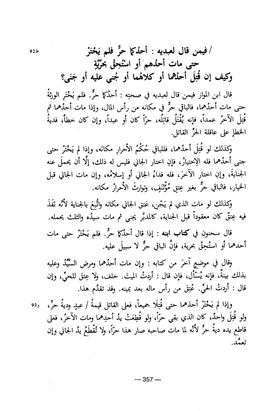 فيمن قال لعبديه: احدكما حر فلم يحتر حتى مات أحدهم او استحق بحرية وكيف إن قتل أحدهما او أجنبى عليه أو جنى؟ قال ابن المواز فيمن قال لعبديه فى صحته: أحدكما حر. فلم يحتر الورثة حتى مات احدهما, فإنه يقتل قاتله, حرا كان او عبدا, وإن كان خطأ, فديه الخطإ على عاقلة الحر القاتل. وكذلك لو قتل أحدهما, فللباقى حكم الاحرار مكانه, وإذا لم يختر حتى جنىأحدهما فله الاختياؤ, فإن اختار الجاانى فليس له ذلك, إلا ان يحمل عنه الجناية, وغن اختار الآخر, فله فداء الجانى او اسلامه, وإن مات الجانى قبل الخيار, فالباقى حر بغير عتق مؤتنف, وتوارث الاحرار مكانه. وكذلك لو مات لم يجن, عتق الجانى مكانه واتبع بالجناية لأنه نفذ فيه عتق كان معقودا قبل الجناية, كالمدبر يجنى ثم مات سيده والثلث يجمله. قال سحنون فى كتاب ابنه: إذا قال أحدكما حر. فلم يختر حتى مات أحدهما او استحق بحرية, فغن الباقى حر لا سبيل عليه. وقال فى موضع آخر من كتابه: وإن مات أحدهما ومرض السيد وعليه بذلك بينه, فغنه يسأل, فإن قال: اردت الميت, حلف, ولا عتق الحى, وإن قال: أردت الحى. عتق من رأس ماله بعد يمينه. وقد تقدم هذا وإذا لم يختر احدهما قتلا جميعا, فعلى القاتل قيمة/ عبد ودية حر, ولو قتل واحد, كان الذى بقى حرا, ولو قعت يد أحدهما ومات الآخر, فعلى قاطع يده ديه حر لأنه لما مات صاحبه صار هذا حرا, ولا تقطع يد الجانى وإن تعمد