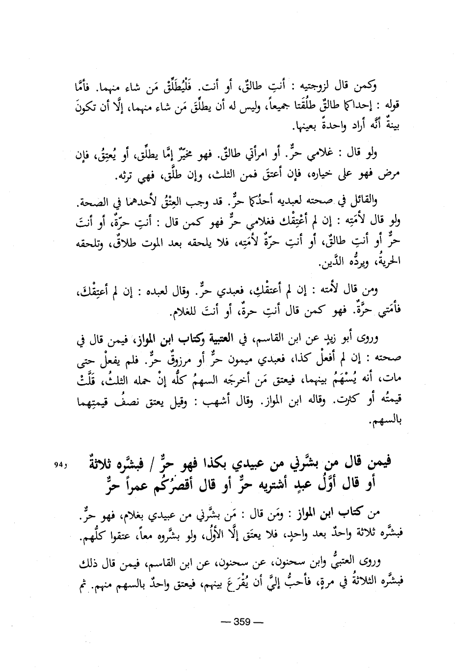 وكمن قال لزجتيه: أنت طالق, او أنت. فليطلق من شاء منهما. فأما قوله: إحداكما طالق طلقتا جميعا, وليس له أن يطلق من شاء منهما, إلا أن يكون بينه أنه أراد واحدة بعينها. ولو قال: غلامى حر. او امراتى طالق. فهو مخير إما يطلق, أو يعتق, فإن مرض فهو على خياره, فإن أعتق فمن ثلث, وإن طلق, فهى ترثه. والقائل فى صحته لعبديه احدكما حر, قد وجب العتق لأحداهما فى الصحة ولو قال لأمته: إن لم أعتقك فغلامى حر فهو كمن قال: أنت حرة, او أنت حر او أنت طالق, أو أنت حرة لأمته, فلا يلحقه بعد الموت طلاق, وتلحقه الحرية, ويردة الدين. ومن قال لأمته: إن لم أعتقك, فعبدى حر. وقجال لعبده: إن لم أعتقك, فامتى حرة. فهو كمن قال حرة, او أنت للغلام. وروى أبو زيد عن ابن القاسم, فى العتبية وكتاب ابن المواز, فليس فيمن قال فى صحته: إن لم أفعل كذا, فعبدى ميمون حر أو مرزوق حر. فلم يفعل حتى صحته: عن لم أفعل كذا, فعبدى ميمون حر, او مرزوق حر. فلم يفعل حتى مات, أنه يسهم بينهما, فيعتق من أخرجه السهم كله إن حمله الثلث, قلت قيمته أو كثرت. وقاله ابن المواز. وقال اشهب: وقيل يعتق نصف قيمتهما بالسهم. فيمن قال من بشرنى من عبيدى بكذا فهو حر/ فبشره ثلاثه او قال أول عبد اشتريه حر أو قال اقصركم عمرا حر ومن كتاب ابن المواز: ومن قال بشرنى من عبيدى بغلام, فهو حر. فبشره ثلاثة واحد بعد واحد, فلا يعتق إلا الأول, ولو بشروه معا. عتقوا كلهم وروى العتبى وابن سحنون, عن سحنون, عن ابن القاسم, قال ذلك فبشره الثلاثة فى مرة, فاحب إلى ان يقرع بينهم, فيعتق واحد بالسهم منهم. ثم