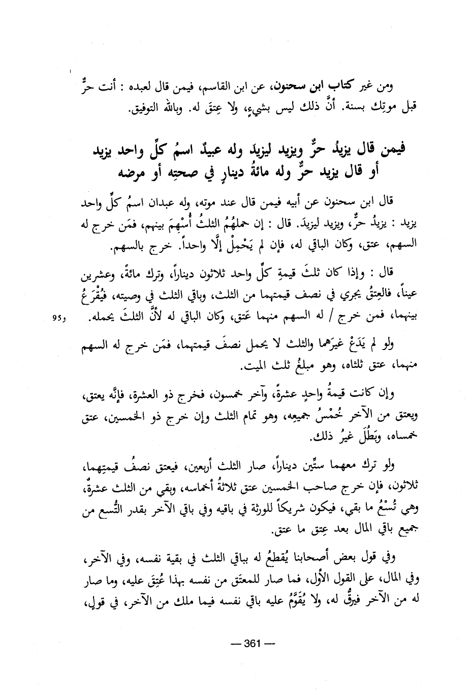ومن غير كتحاب اببن سحنون, عن ابن القاسم, فيمن قال لعبده: انت حر قبل موتك بسنة. أن ذلك ليس بشىء ولا عتق له. وبالله التوفيق. فيمن قال يزيد وله عبيد اسم كل واحد يزيد او قال يزيد حر وله مائة دينار فى صحته أو مرضه قال ابن سحنون عن ابيه فيمن قال عند موته, وله عبداان اسم كل واحد يزيد: ليزيد حر, ويزيد. قال: إن حملهم الثلث اسهم بينهم, فمن خرج له السهم, عتق وكان الباقى له, فإن لم يحتمل إلا واحدا. خرج بالسهم. قال: وإذا كان ثلث قيمة كل واحد ثلاثون دينارا, وترك مائة, وعشرين عينا, فالعتق يجرى فى نصف قيمتها من الثلث, وباقى الثلث فى وصيته, فيقرع بينهما, فمن خرج/ له السهم منهما عتق, وكان الباقى له لأن الثلث يحمله. ولو يدع غيرهما والثلث لا يحمل نصف قيمتهما, فمن خرج له السهم منهما, عتق ثلثاه, وهو مبلغ ثلث الميت. وإن كانت قيمة واحد عشرة, وآخر خمسون, فخرج ذو العشرة, فإنه يعتق, خمساه, وبطل غير ذلك. ولو ترك معهما ستين دينارا, صار الثلث, فيعتق قيمتهما, ثلاثون, فإن خرج صاحب الخمسين عتق ثلاثة اخماسه, وبقى من الثلث عشرة, وهى تسع ما بقى, فيكون شريكا للورثة فى باقي الآخر بقدر التسع من جميع باقى المال بعد عتق ما عتق. وفى قول بعض اصاحبنا يقطع له بباقى الثلث فى بقية نفسه, وفى الآخر, وفى المال, على القول الأول, فما صار من نفسه بهذا عتق عليه, وما صار له من الآخر فيرق له, ولا يقوم عليه باقى نفسه فيما ملك من الآخر, فى قول
