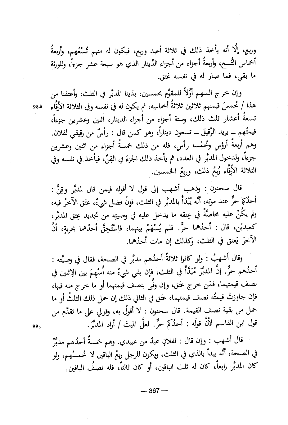 ورببع إلا أنه يأخذ فى ثلاثة أعبد وربع, فيكون له منهم تسعتهم, وأربعة اخماس التسع, وأربعة أجزاء من اجزاء الدينار الذى هو سبعة عشر جزءا وللورثة ما بقى, فما صار له فى نفسه عتق. وغن خرج السهم اولا للمقوم بخمسين, بدينا المدبر فى الثلث, واعتقنا من هذا/ خمس قيمتهم ثلاثين أخماسه, ثم يكون له فى نفسه وفى الثلاثة الارقاء تسعة أعشار ثلث ذلك, وسته اجزاء الدينار, اثنين وعشرين جزءا, قيمتهم- يريد الرقيق- تسعون دينارا, وهو كمن قال: رأس من رقيقى لفلان. وهم أربعة أرؤس وخمسا راس, فله من ذلك الجزء فى القن, فيأخذ فى نفسه وفى الثلاثة الارقاء ربع ذلك, وربع الخمسين. قال سحنون: وذهب أشهب إلى قوله لا أقول فيمن قال لمدبروقن: أحدكما حر عند موته, أنه يبدأ بالمدبر فى الثلث, فإن فضل شىء, عتق الاخر فيه, ولم يكن عليه محاصة فى عتقه ما يدخل عليه فى وصياته من تجديد عتق المدبر, كعبدين, قال: احدهما حر. فلم يسهم بينهما, فاستحق احدهما بحرية, أن الآخر يعتق فى الثلث, وكذلك عن مات أحدهما. وقال أشهب: ولو كانوا ثلاثة احدهم مدبر فى الصحة, فقال فى وصيته: احدهم حر. إن المدبر مبدأ فى الثلث, فإن بقى شىء منه أسهم بين الاثنين فى نصف قيمتهما, فمن خرج عتق, وإن وفى بنصف قيمتهما أو ما خرج منه فيها, فإن جاوزت قيمته نصف قيم\تهما, عتق فى الثانى ذلك إن حمل الثلث أو ما حمل من بقية نصف القيمة. قال سحنون: لا أقول به, وقولى على ما تقدم من قول ابن القاسم لأن قوله: احدكم حر. لعل الميت/ أراد المدبر. قال اشهب: وإن قال لفلان عبد من عبيدى. وهم الخمسة احدهم مدبر فى الصحة, انه يبدأ بالذى فى الثلث, يكون للرجل ربع الباقين لا خمسهم, ولو كان المدبر رابعا, كان له ثلث الباقين, أو كان ثالثا, فله نصف الباقين