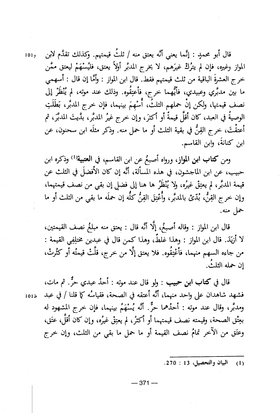 قال أبو محمد: إنما يعنى أنه يعتق منه/ ثلث قيمتهم. كذلك تقدم لابن المواز وغيره, فإن لم يترك غيرهم, لا يخرج المدبر أولا يعتق, فليسهم ليعتق ممن خرج العشرة الباقية من ثلث قيمتهم فقط. قال ابن المواز: وأما إن قال: أسهمى ما بين مدبى وعبيدى, فأيهما خرج, فاعتقوه. وذلك عند موته, لم ينظر الى نصف قيمتها, ولكن إن حملهم الثلث, اسهم بينهما, فإن خرج المدبر, بطلت الوصية فى العبد, كان أقل قيمة او أكثر, وغن خرج غير المدبر, بديت المدبر, ثم أعتقت, خرج القن فى بقية الثلث او ما حمل منه. وذكر مثله ابن سحنون, عن ان كنانة, وابن القاسم. ومن كتاب ابن المواز, ورواه اصبغ عن ابن الاقسم, فى العتبية (¬1) وذكره ابن حبيب, عن ابن الماجشون, فى هذه المسألة, انه إن كان الافضل فى لاثلث عن قيمة المدبر, لم يعتق غيره, ولا ينظر ها هنا إلى فضل عن بقى من نصف قيمتهما, وإن خرج القن, بدى بالمدبر, وأعتق القن كله عن حمله ما بقى من الثلث أو ما حمل منه. قال ابن المواز: وقاله أصبغ, غلا انه قال: يعتق منه مبلغ نصف القيمتين, لا أزيد. قال ابن المواز: وهذا غلط, وهذا كمن قال فى عبدين مختلفى القيمة: من جاءهالسهم منهما, فاعتقوه. فلا يعتق إلا من خرج, قلت قيمته اوكثرت, إن حمله الثلث. قال فى كتاب ابن حبيب: ولو قال عند موته: أحد عبدى حر. ثم مات, فشهد شاهدان على واحد منهما, أمه اعتقه فى الصحة, فيقاسمه كما قلنا/ فى عبد ومدبر, قال عند موته: احدهما حر. انه يسهم بينما, فإن خرج المشهود له بعتق الصحة, قيمته نصفقيمتهما او أكثر, لم يعتق غيره, عن كان أقل, عتق, وعتق من الآخر تمام نصف القيمة او ما حمل مابقى من الثلث, وإن خرج